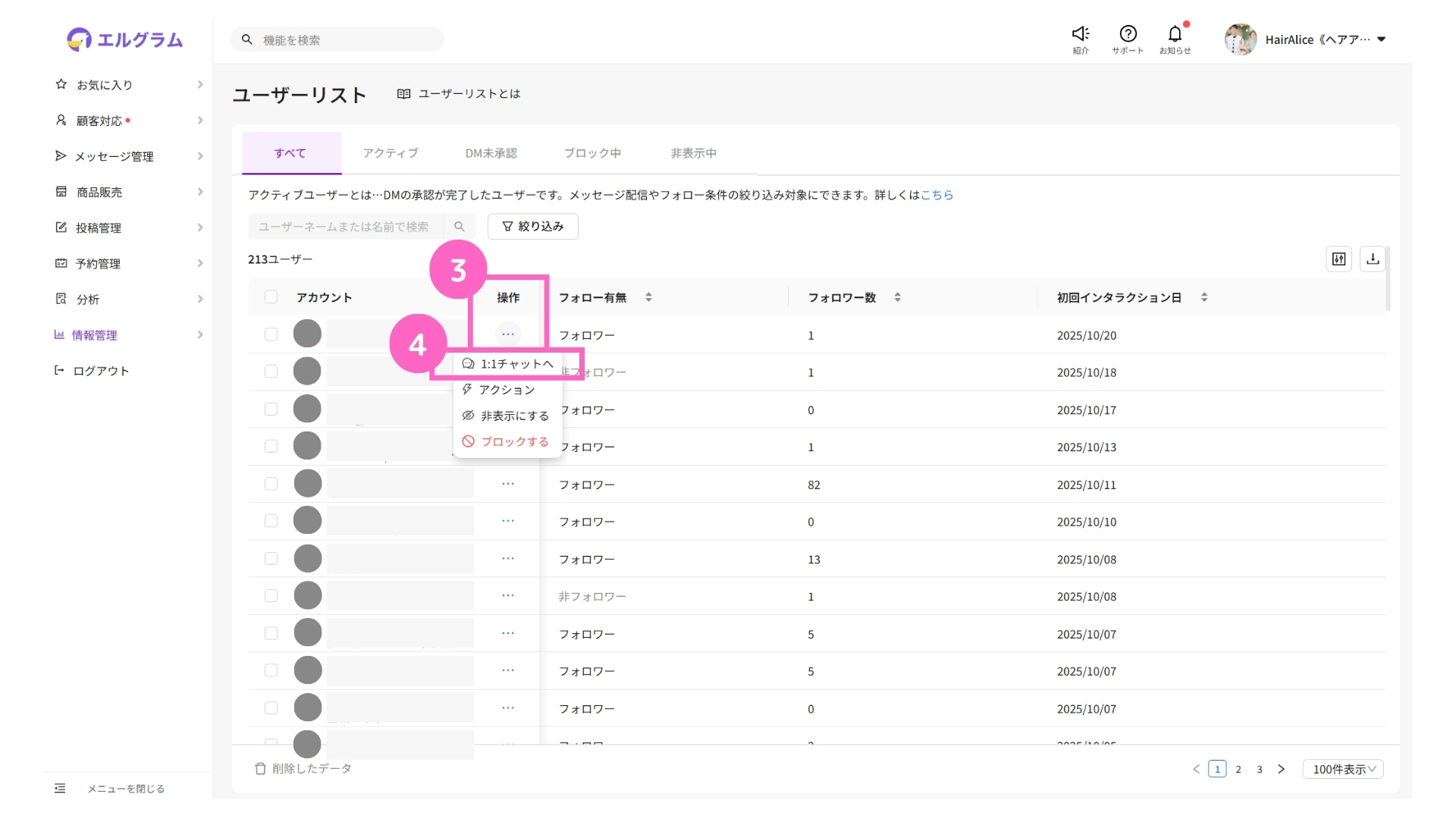 個別のお客様に対して、ユーザーリストからメッセージを送信することができます。