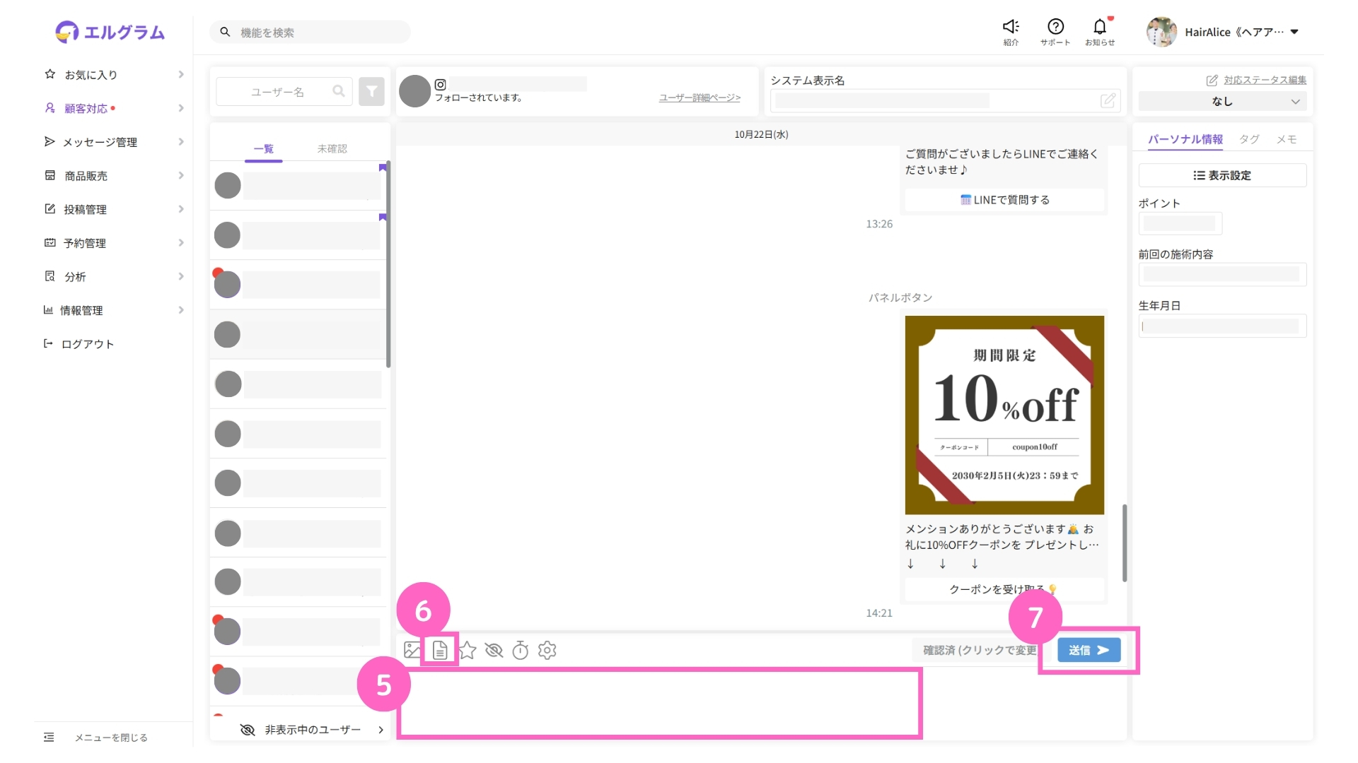→ 施術履歴や注意事項を一括更新でき、情報共有がスムーズになります。 - 個別メッセージ送信でパーソナルなフォロー