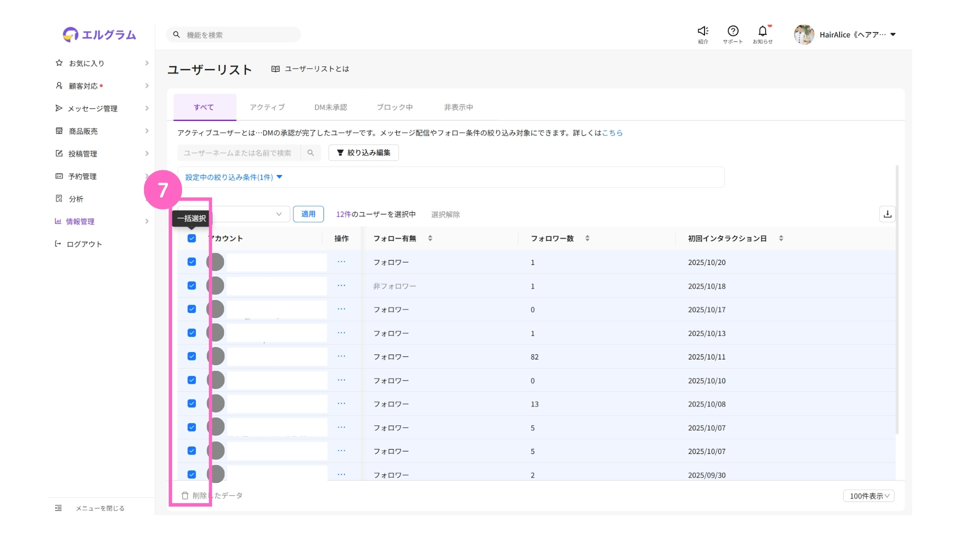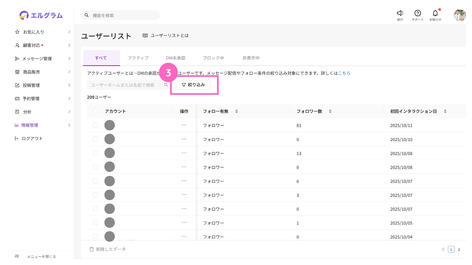 さらに「絞り込み」機能を活用することで、特定の条件を持ったユーザーだけを抽出できます。