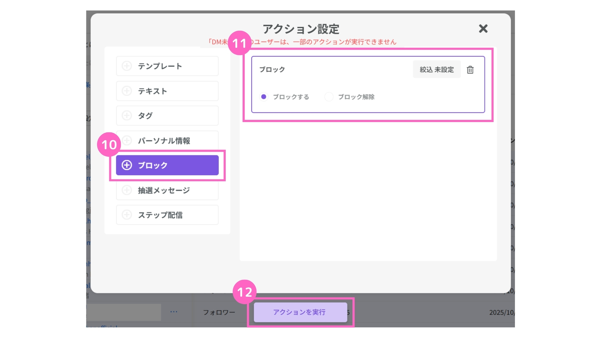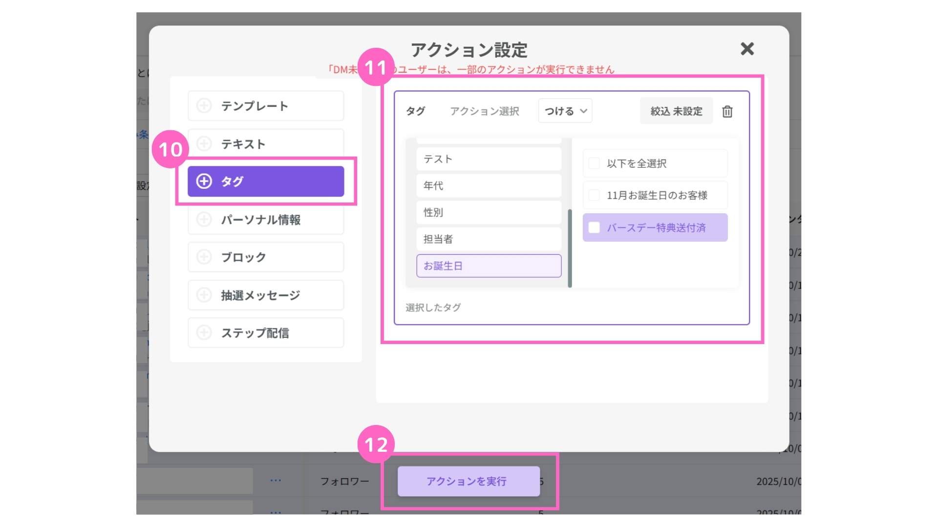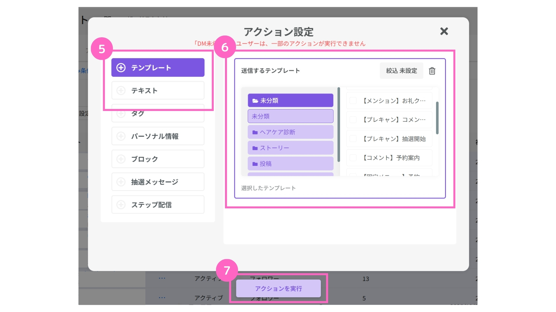 抽出したユーザーに、テンプレート送信やタグ付けなどのアクション設定を行えます。