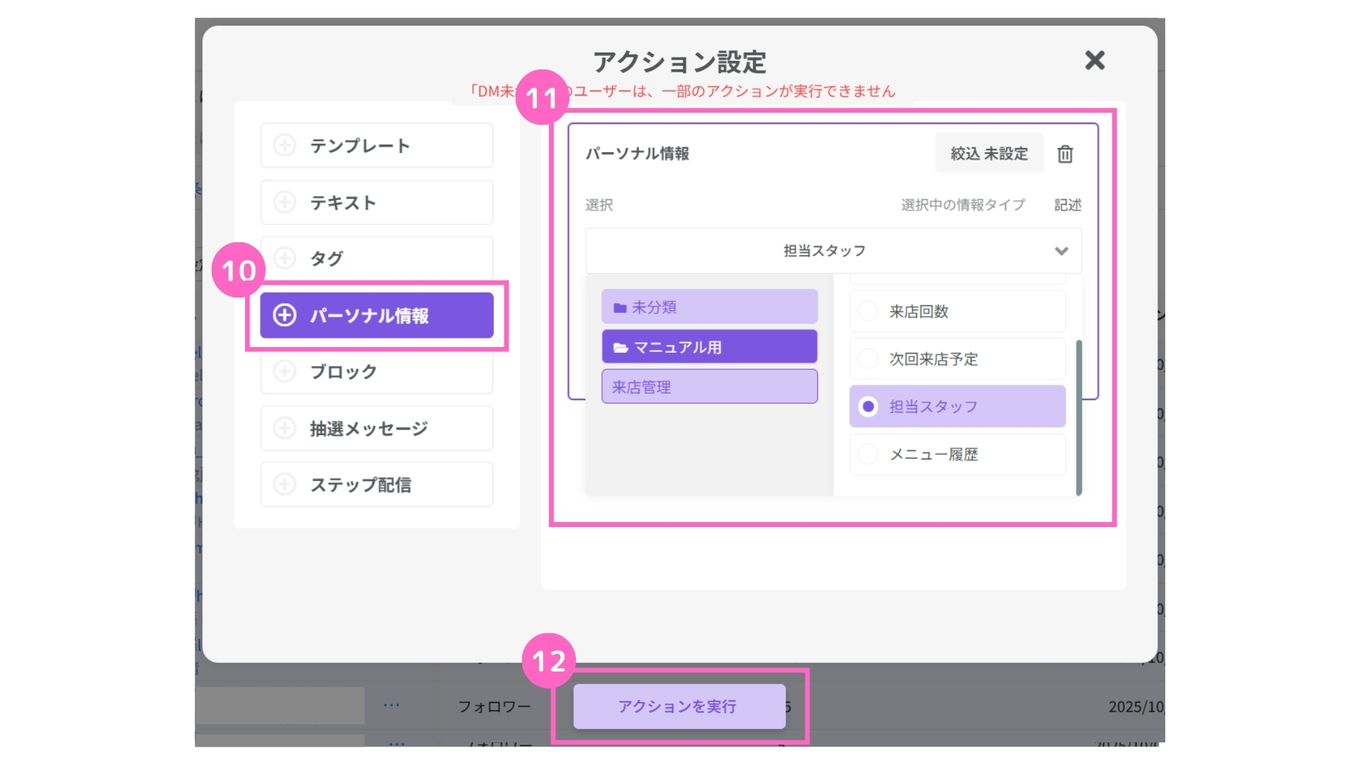 - 一括アクションでキャンペーンや新メニューをDMで案内