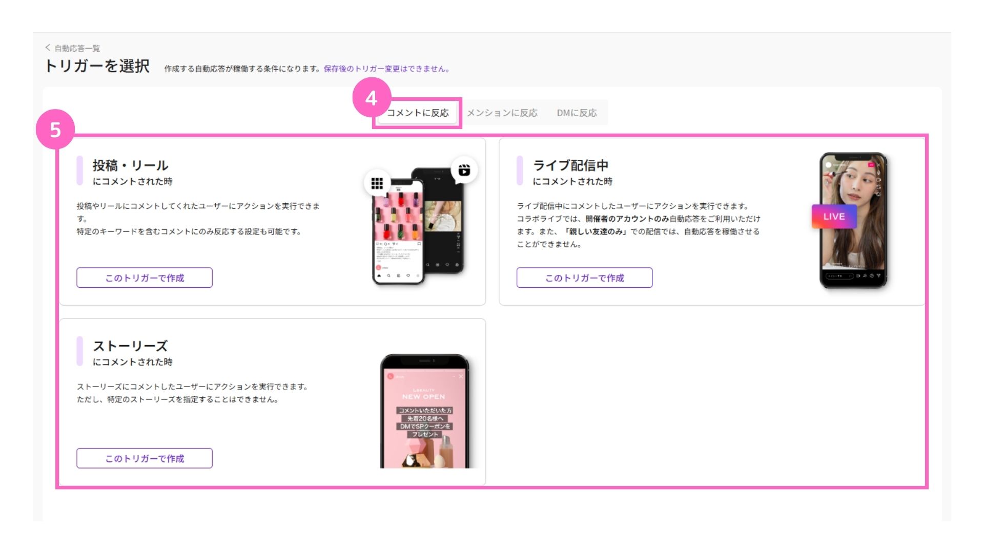 「ストーリーズにコメント」をトリガーとした場合の設定について説明します。
