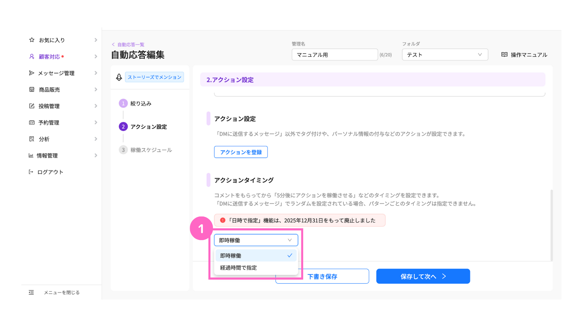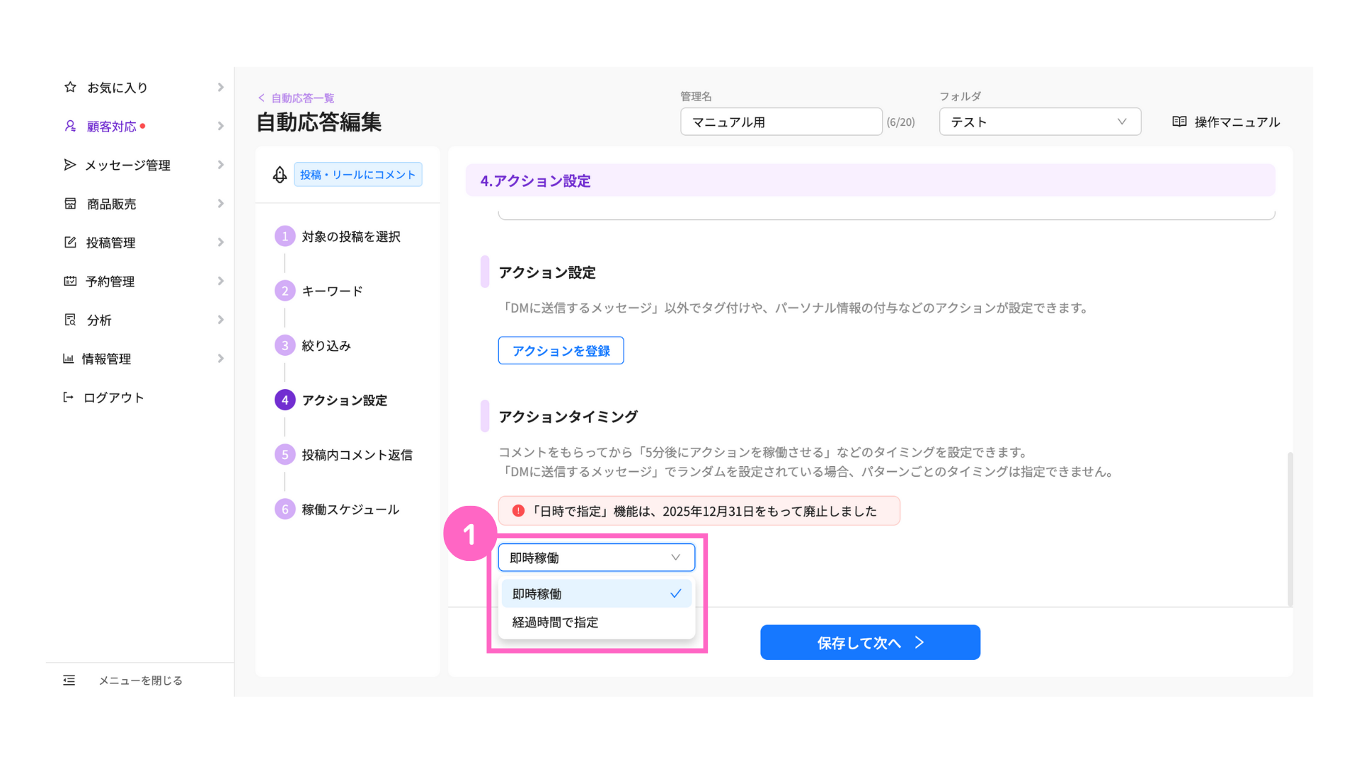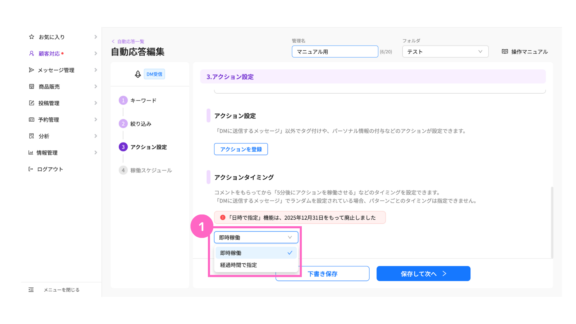 自動応答を稼働させるタイミングの指定ができます。内容によっては返信を遅らせることで、手作業で対応していると感じてもらいやすくなり、顧客の満足度が向上する可能性があります。