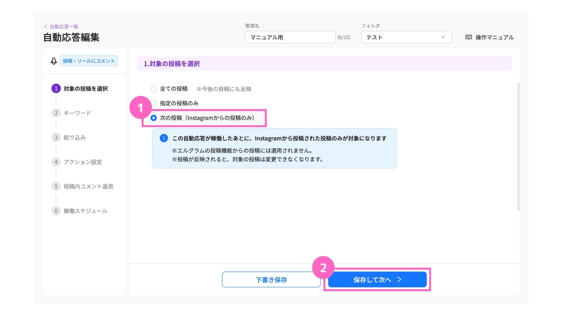 全ての投稿を選択した場合、今後の投稿へも自動応答が反映されます。