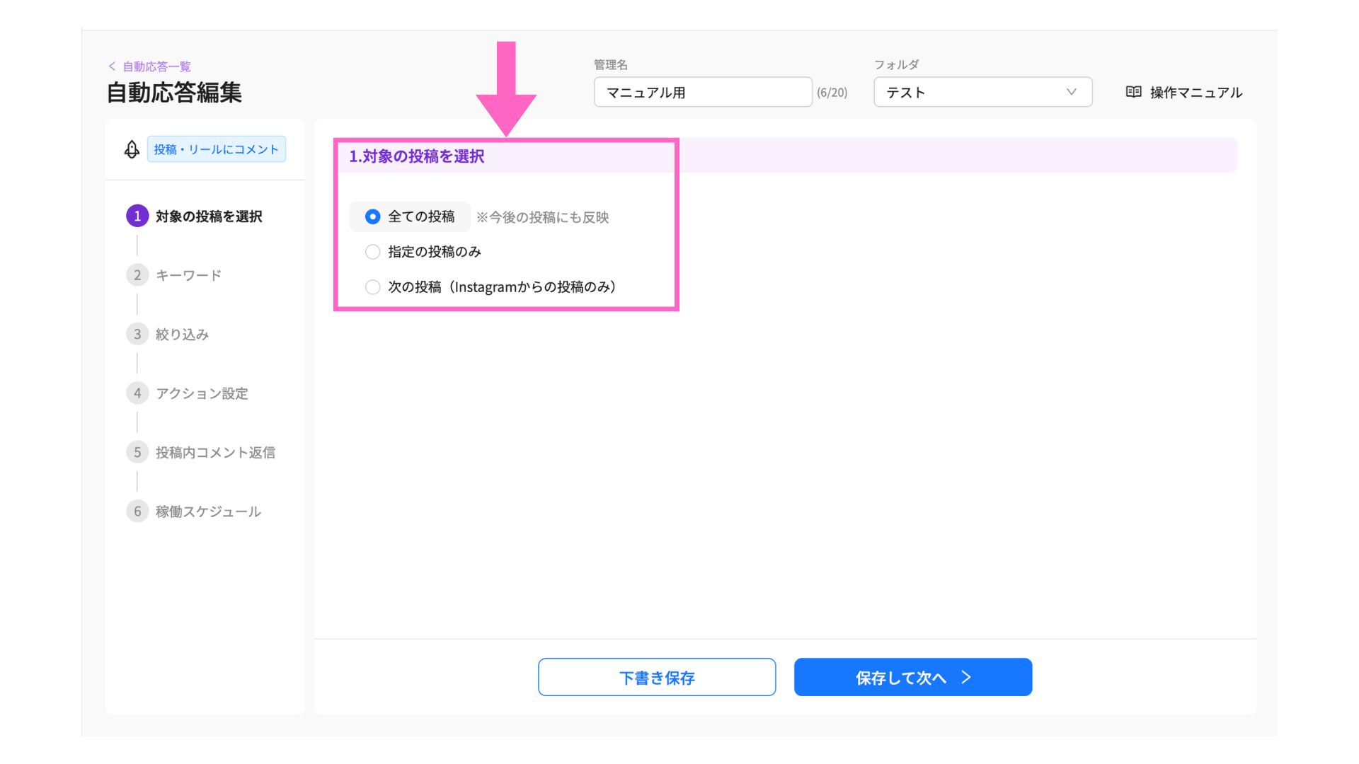 まずは、自動応答を稼働させる対象の投稿を選択します。