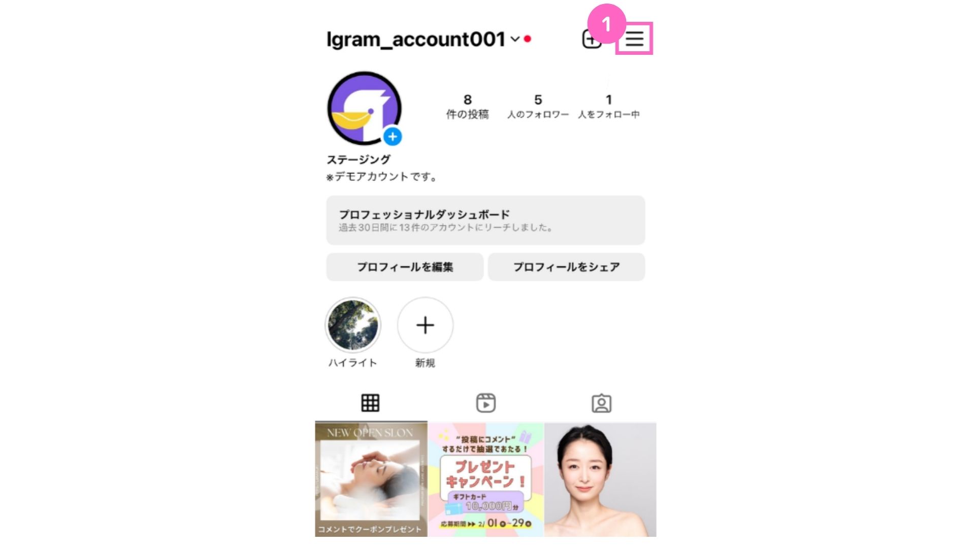 まず、Instagramアカウントのプロフィール画面を表示してください。