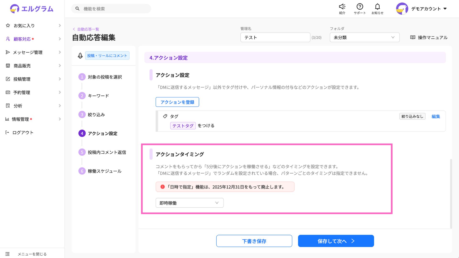 2026年1月1日以降、上記の設定が含まれる自動応答は、すべて「下書き」に自動変更され、稼働しなくなります。継続して自動応答を利用されたい場合は、お手数ではございますが、「即時稼働」または「24時間以内の稼働」へ変更をお願いいたします。