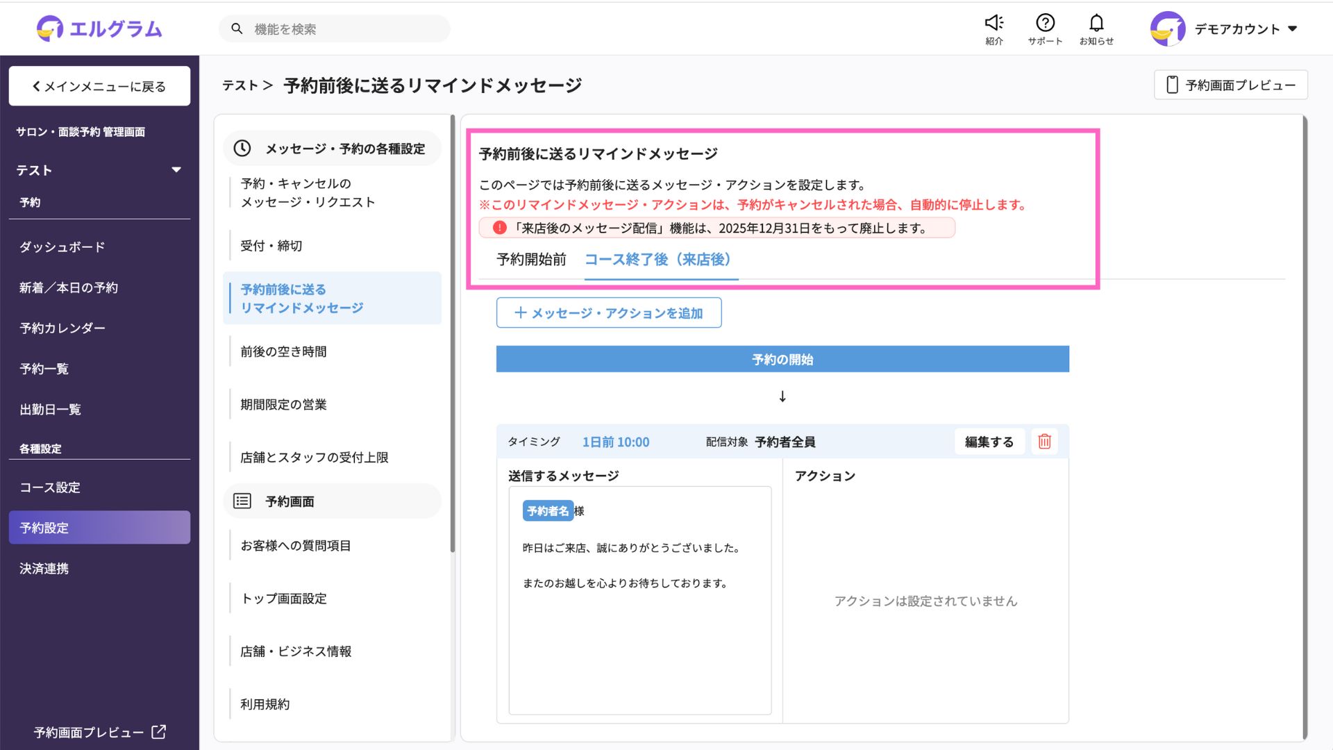 予約管理機能の「来店後メッセージ」