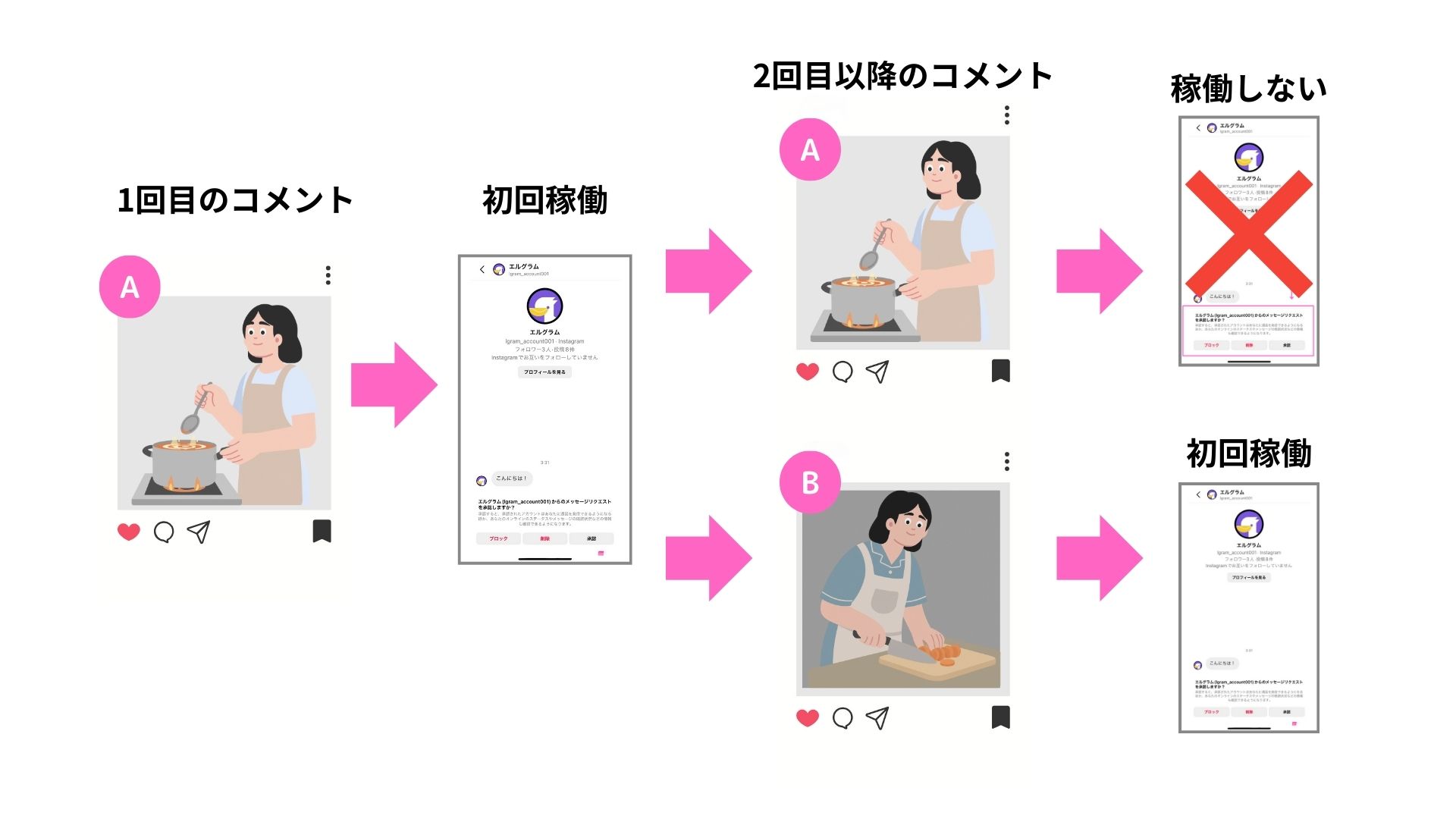 ユーザー情報を取得していない場合でも、各投稿の初回コメントでは例外的にメッセージを含む自動応答が稼働します。