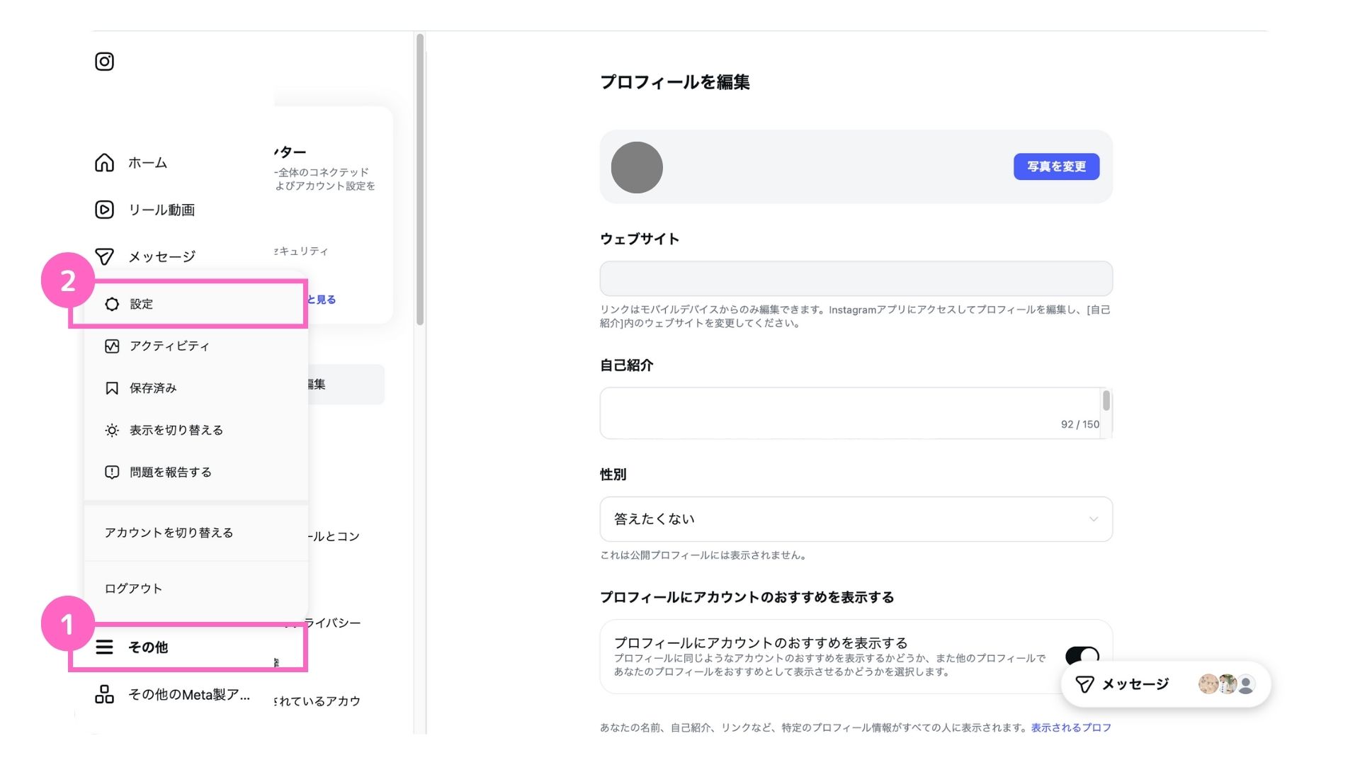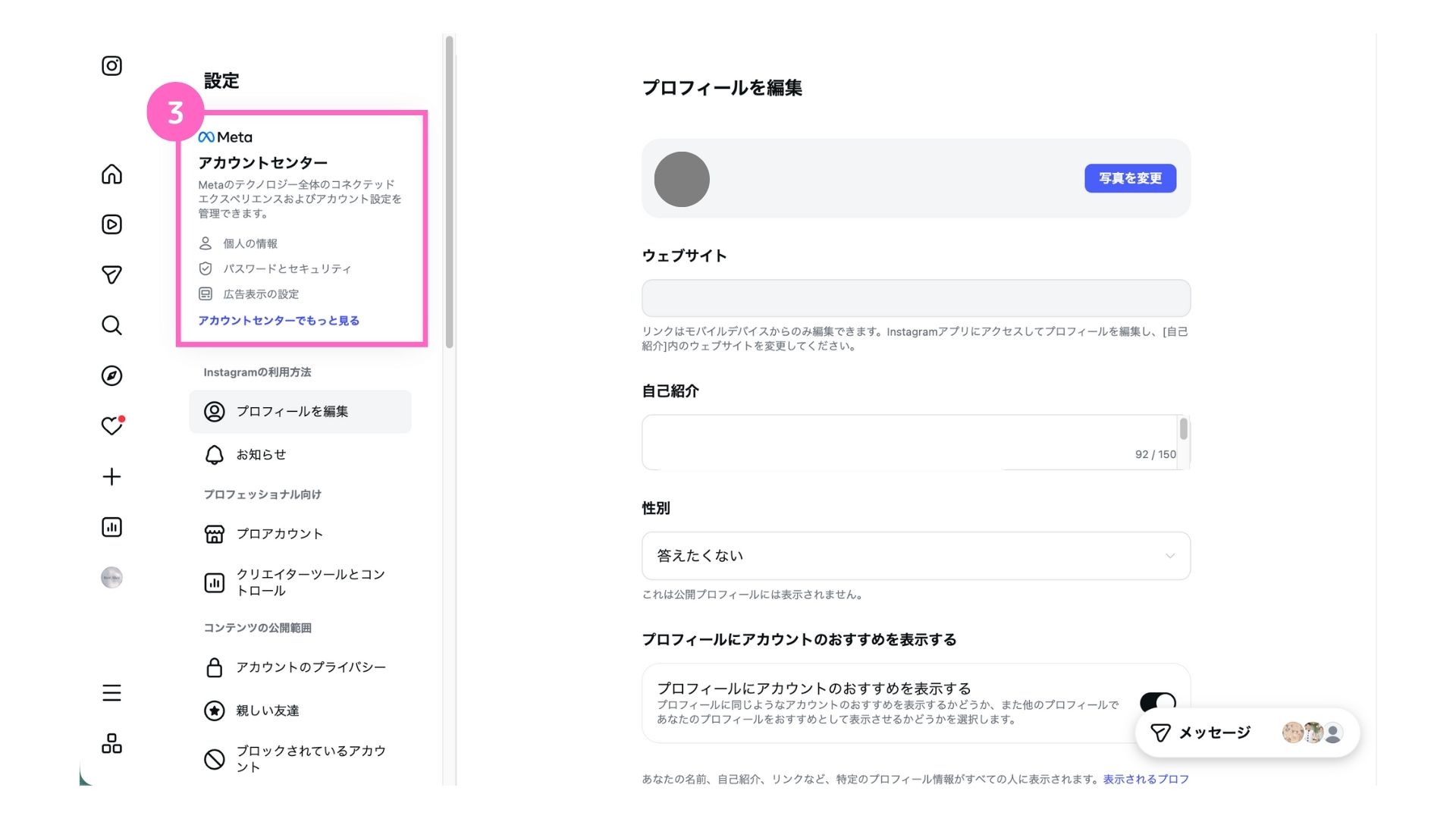 ③「アカウントセンター」をクリック
