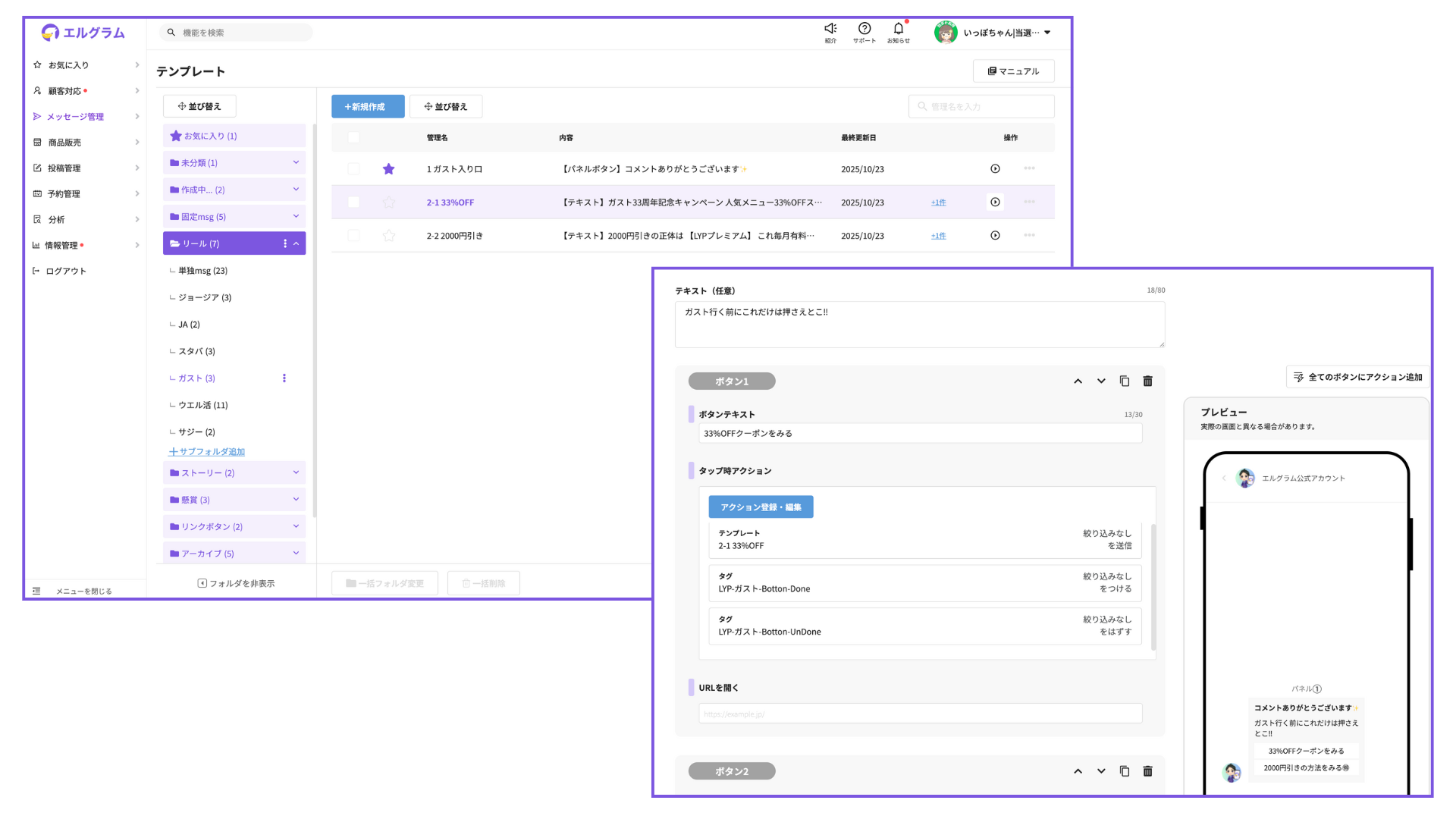 管理画面はとても直感的で、テンプレート化やフォルダ分けができるので、複雑な導線でもスッキリ整理しながら運用できます。