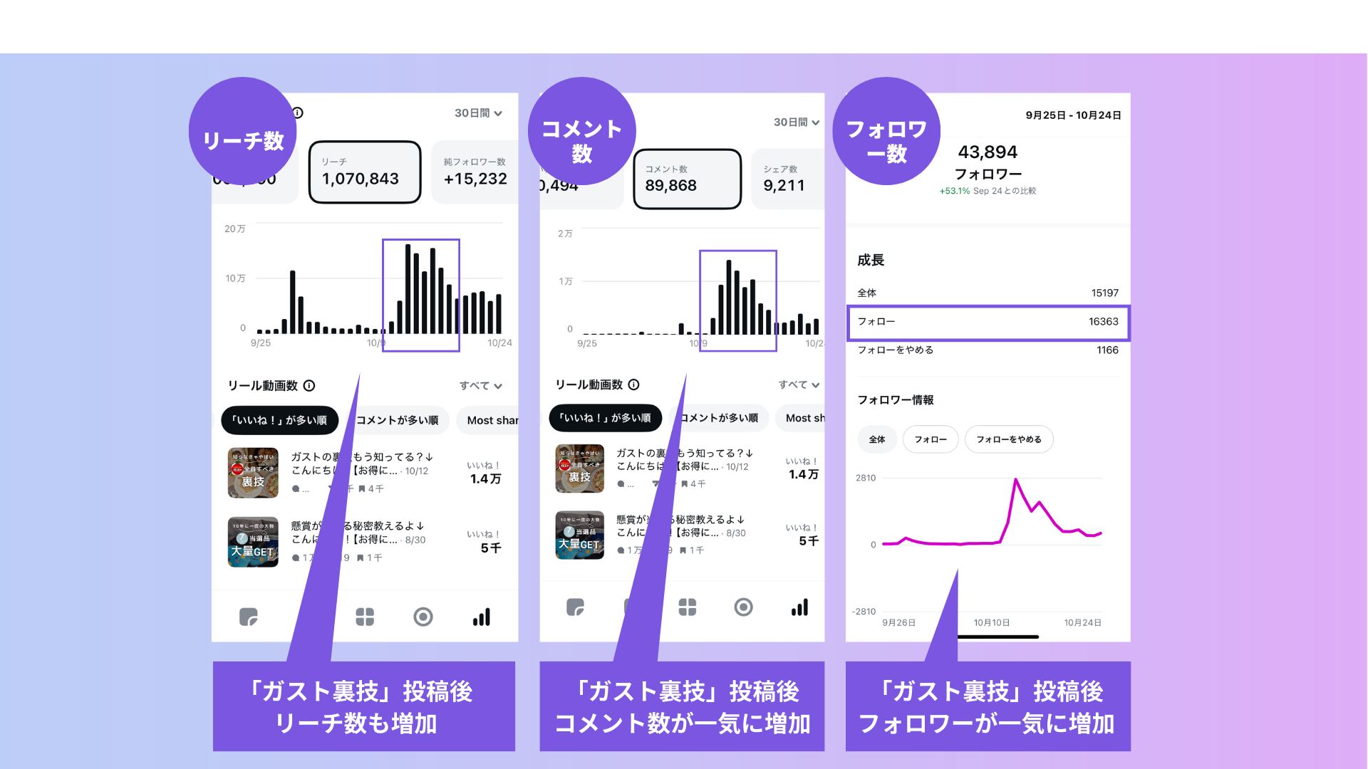 2025年10月投稿の「ガスト全員すべき裏技」でも、「リール × コメント誘導 × 自動DM」の三段構えが効果を発揮