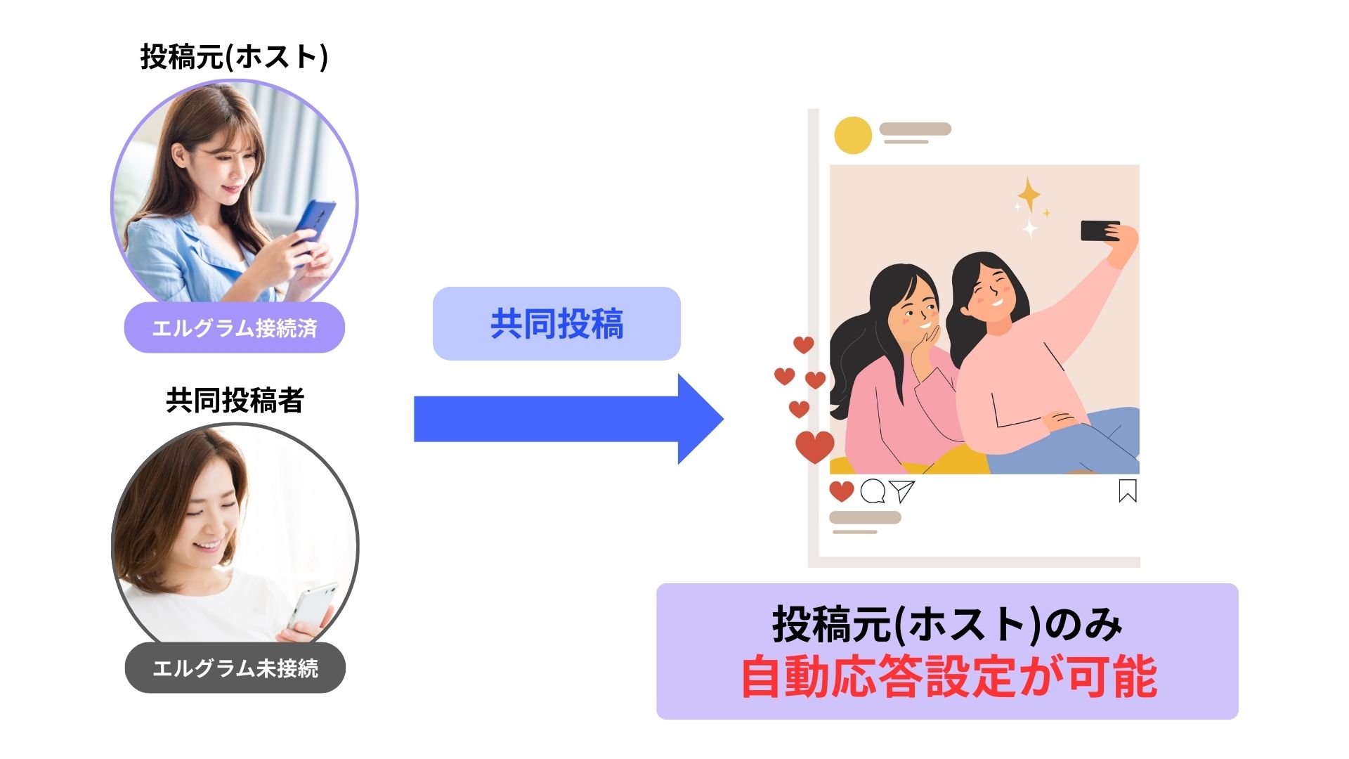 ただし、エルグラムと接続しているユーザーが、投稿元(ホスト)として投稿した場合、自動応答を設定できます。