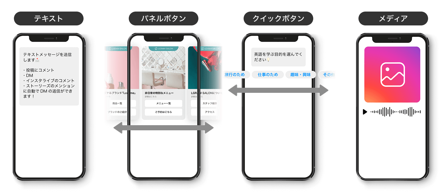 | メディア | 画像・動画・音声を送信でき、画像にはリンクやアクションを設定することも可能です。 |
