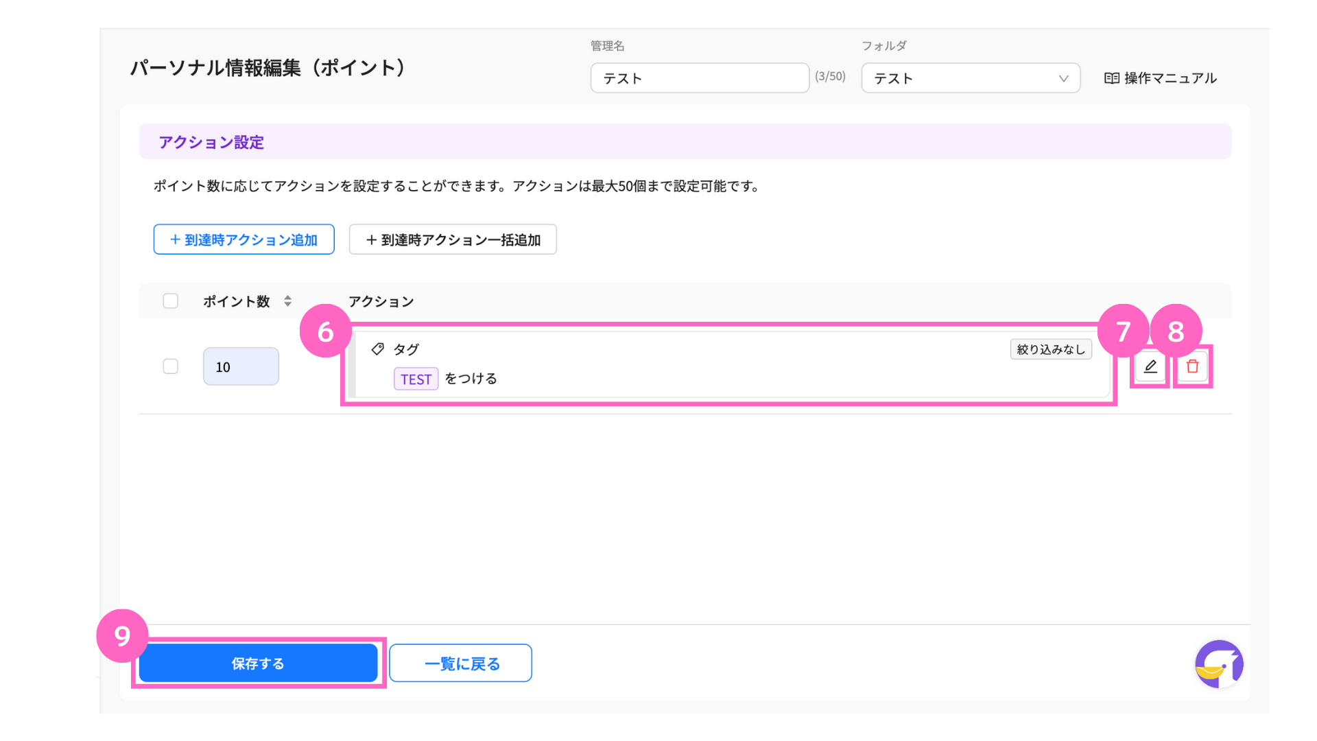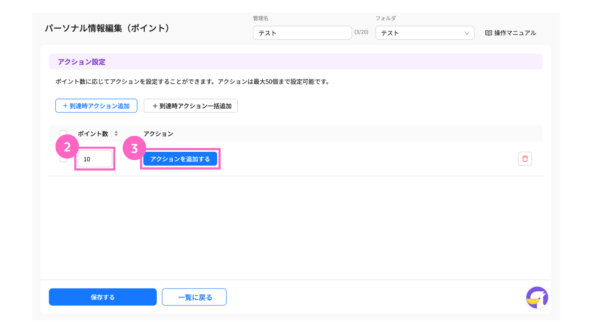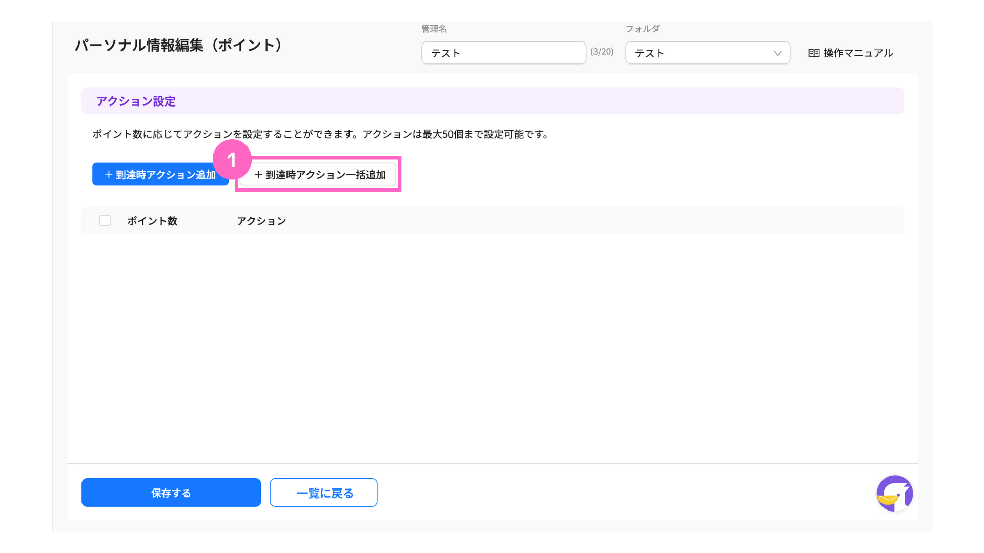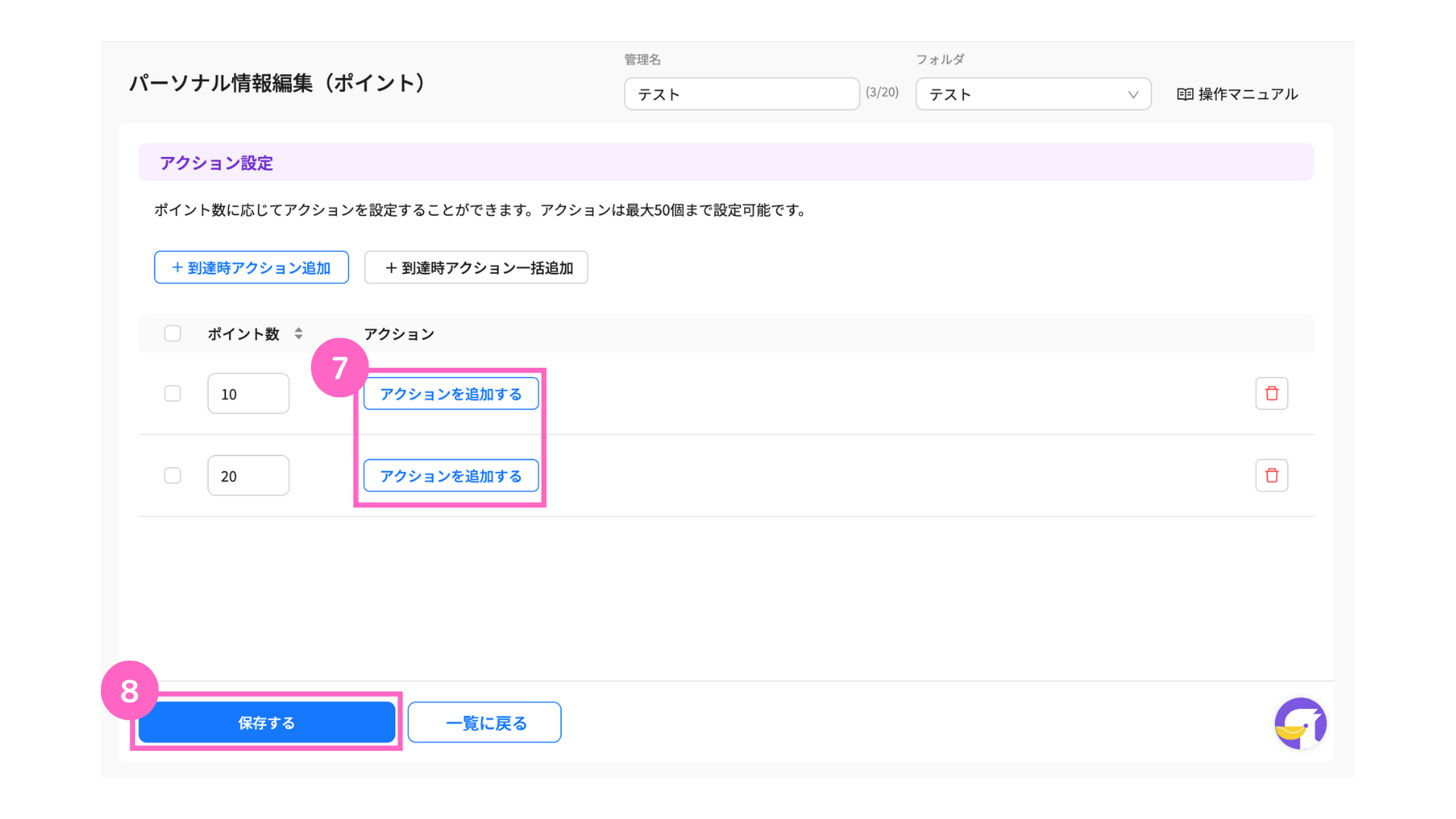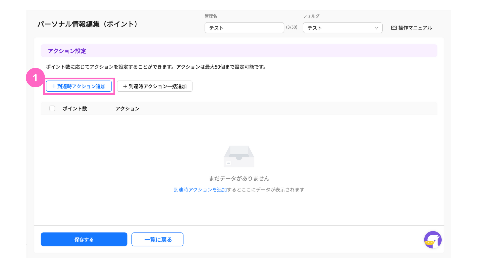 ポイントや到達時アクションを一つずつ追加し、設定が可能です。
