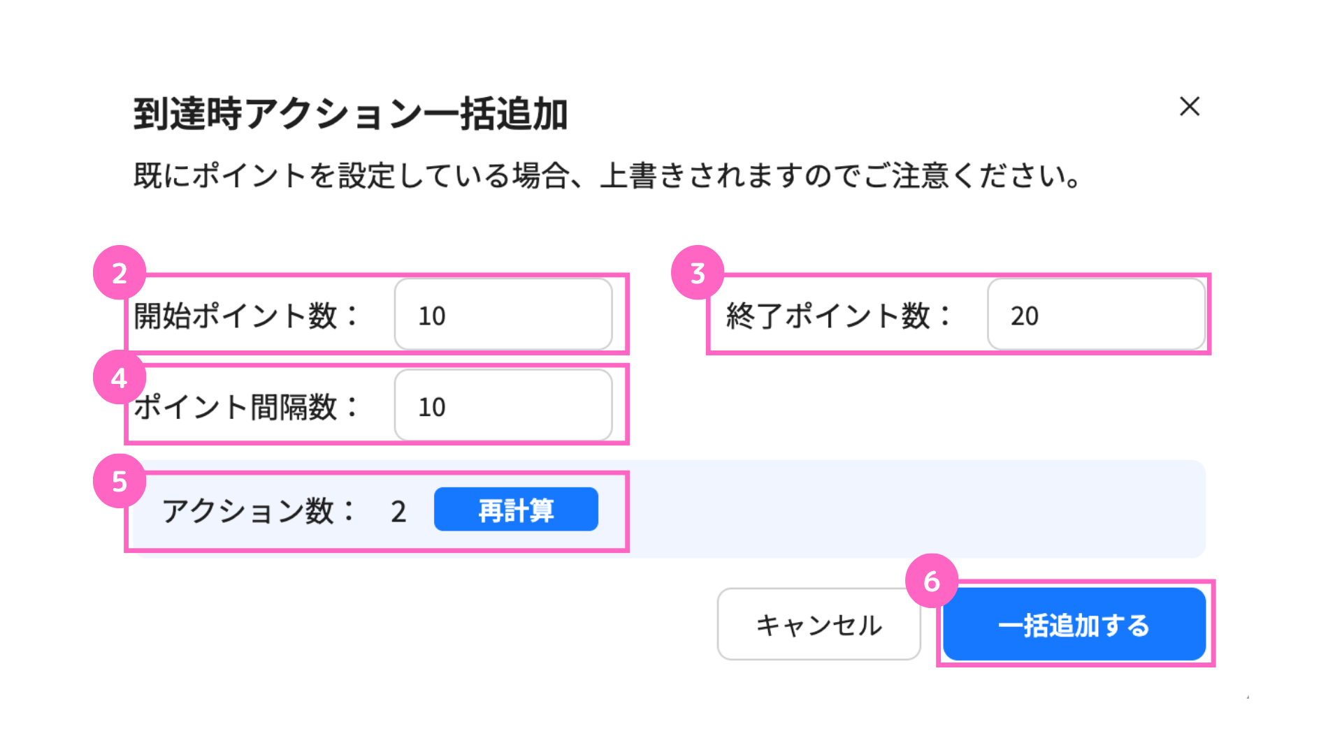 複数のポイントや、到達時アクションをまとめて一括で設定可能です。