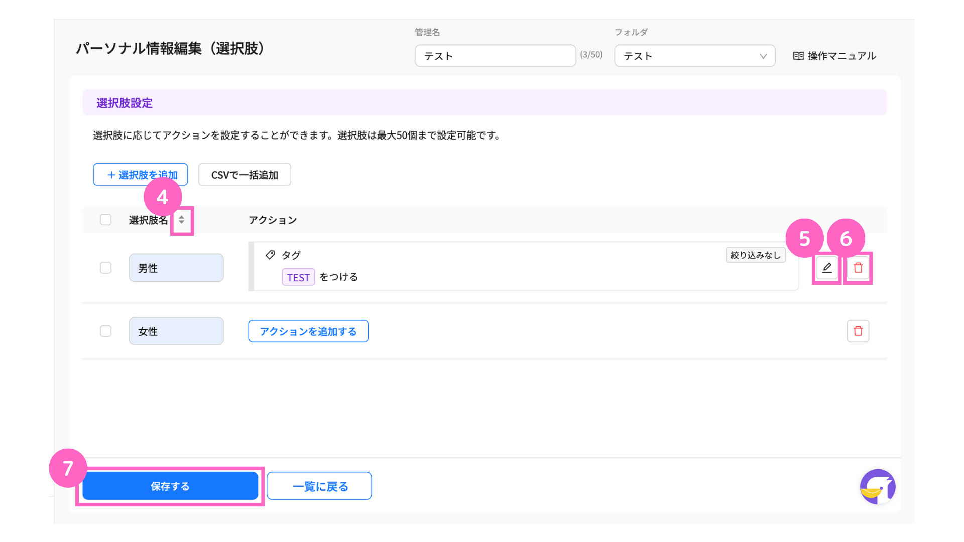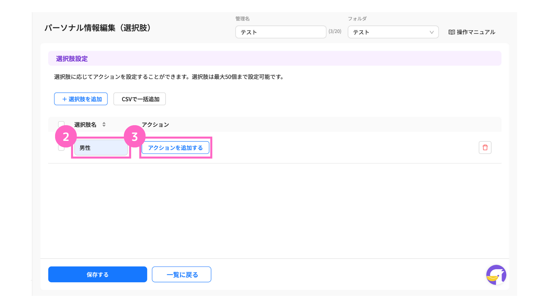 | 選択肢 | ユーザーが選択する 選択肢を作成 | 年代・性別 |