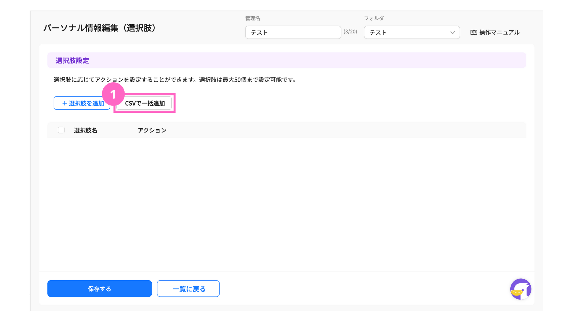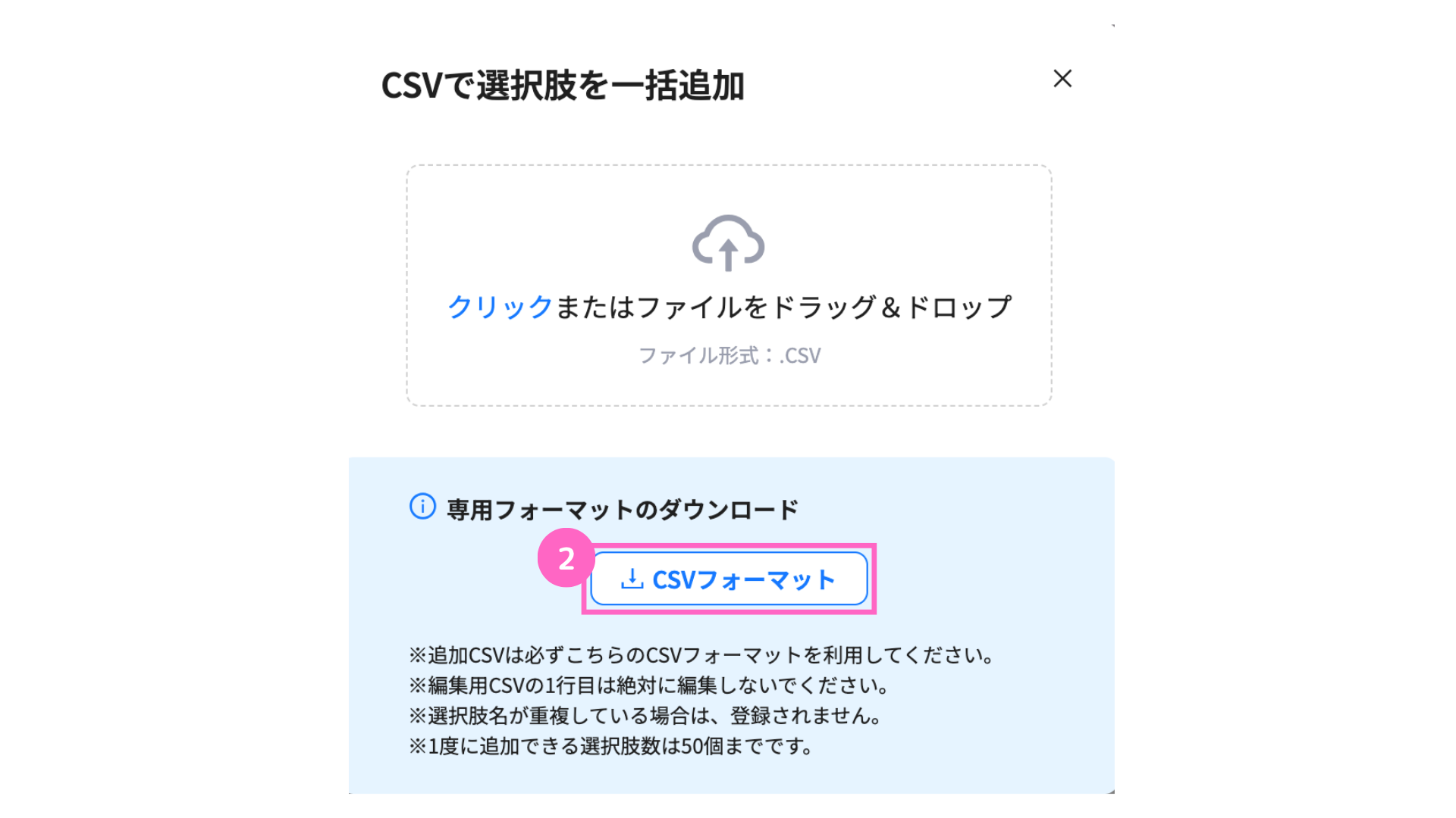 CSVデータで取得した情報をもとに選択肢を追加する場合は、こちらを選択します。