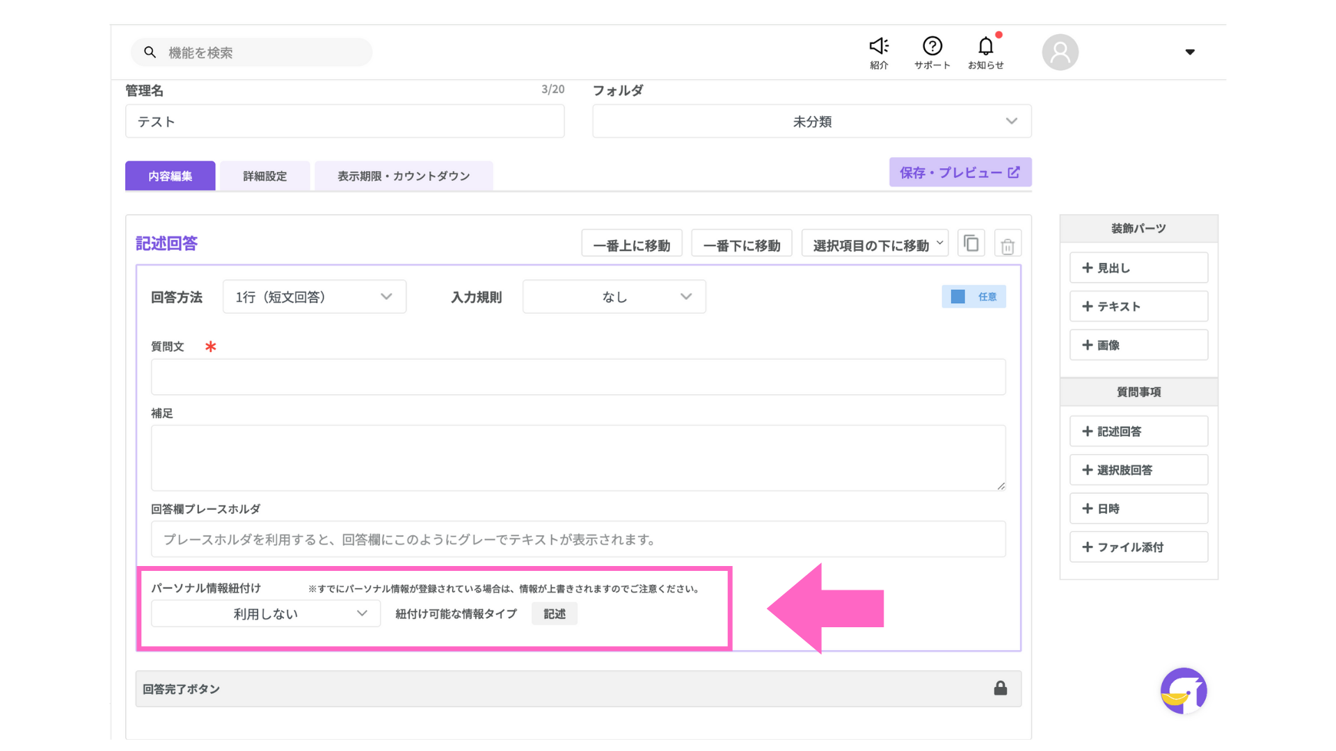 フォーム作成時に設定を行うことで、フォームの回答とパーソナル情報の紐づけが可能です。
