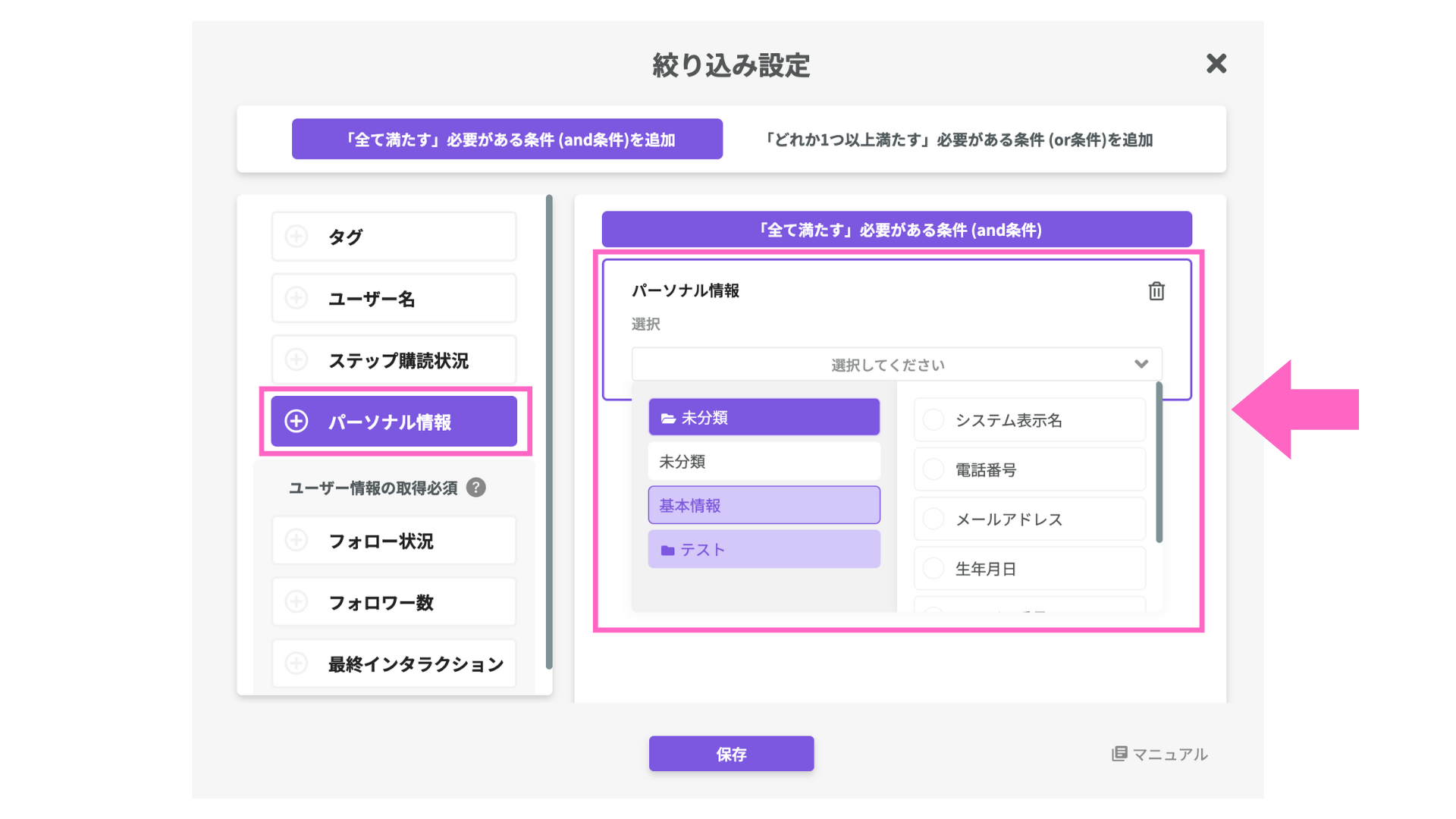 パーソナル情報で、絞り込み設定を行うことも可能です。