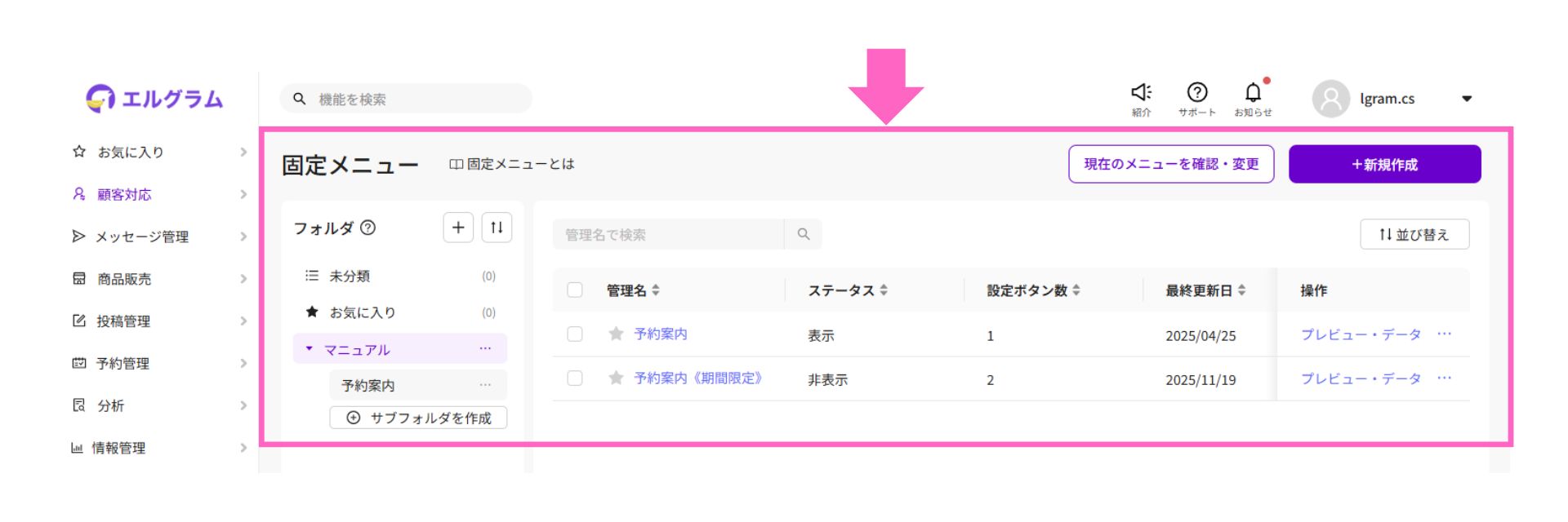 固定メニューは、InstagramのDM上でユーザーがアクセス可能なメニューを設置できる機能です。