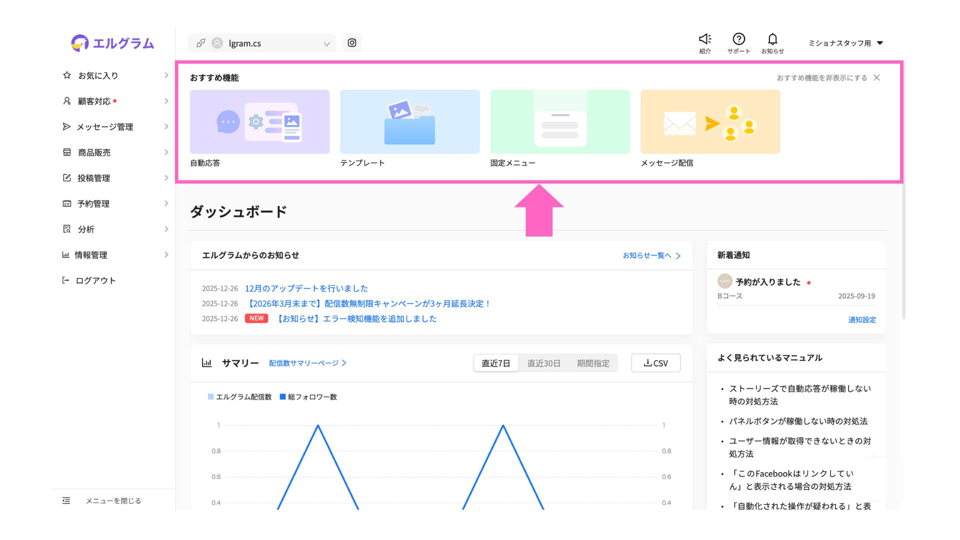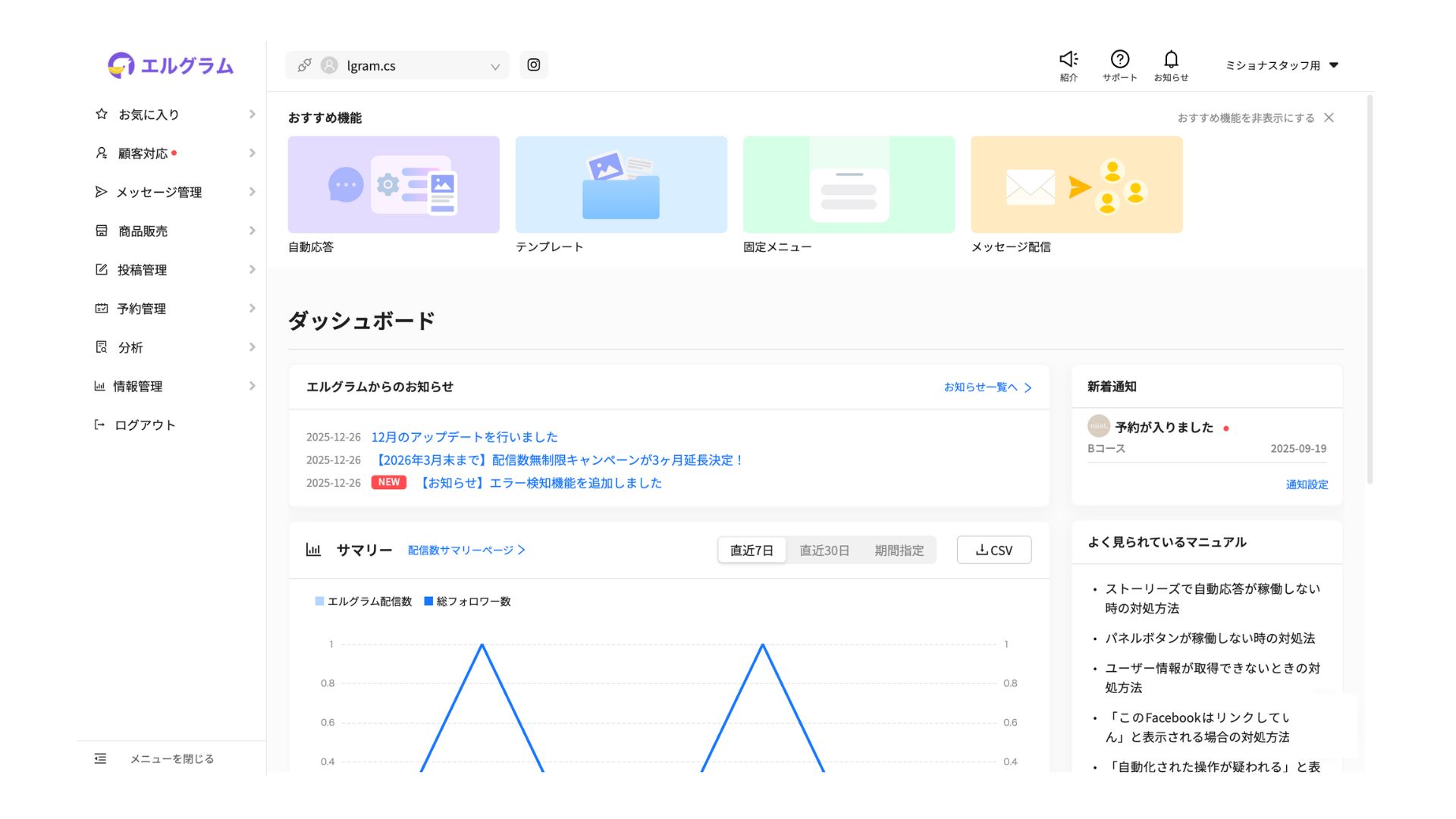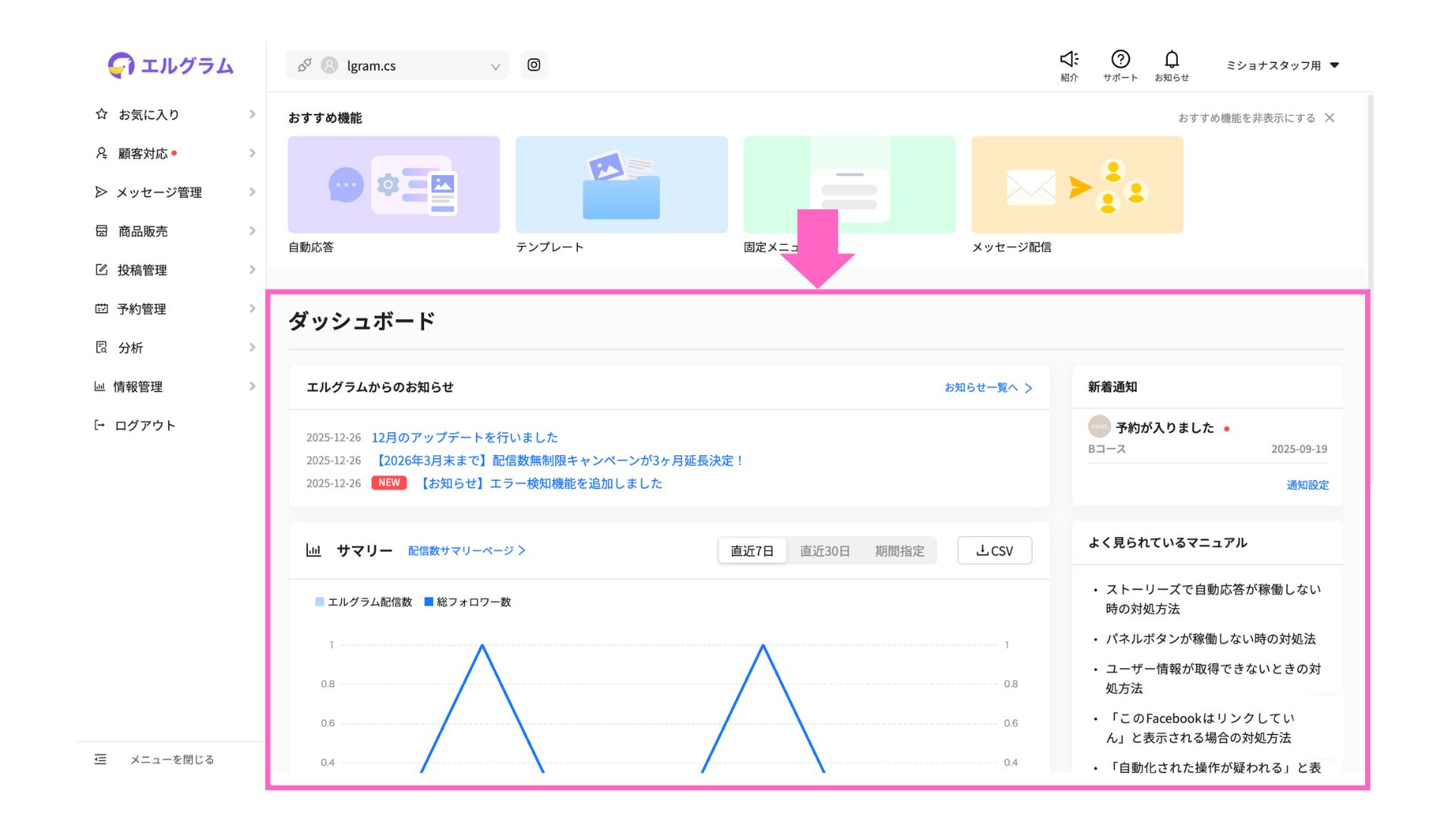 エルグラムのマニュアルや稼働状況などを確認できる、ダッシュボードが追加されました。