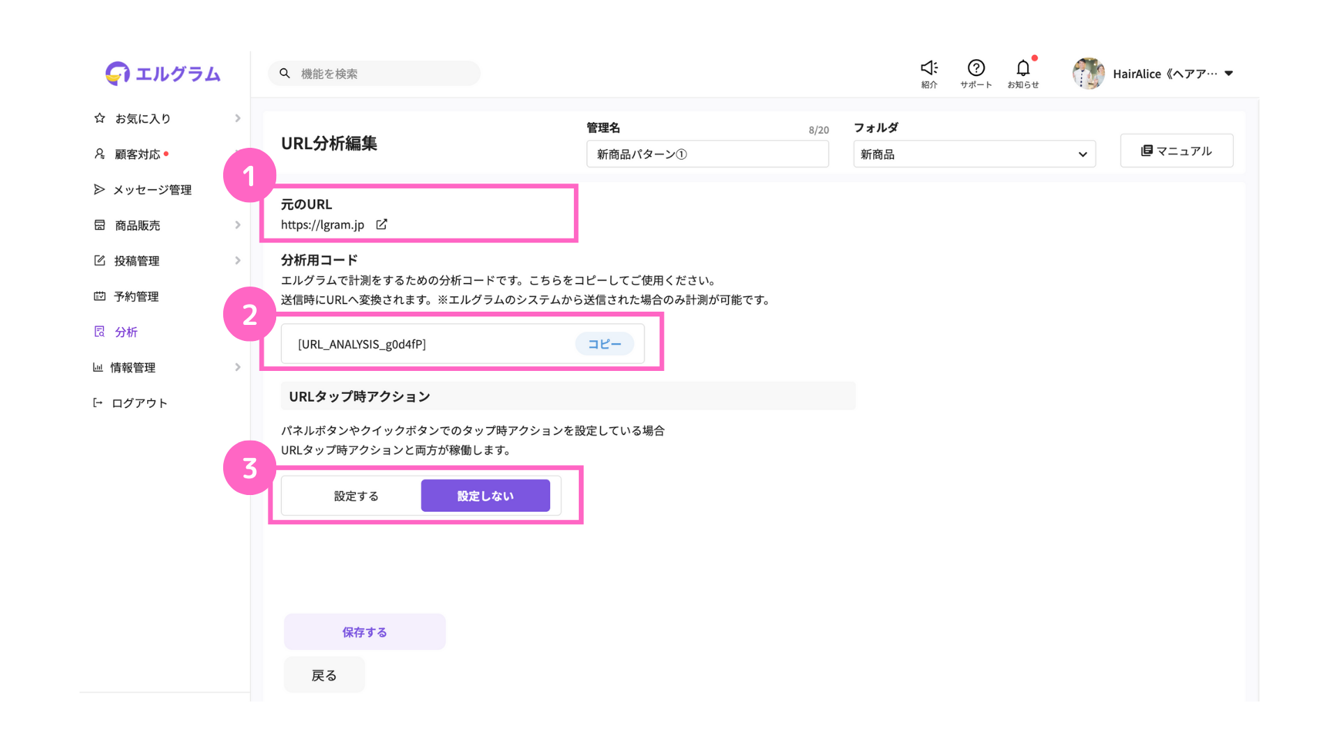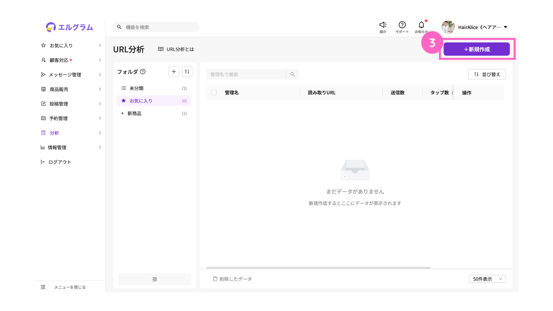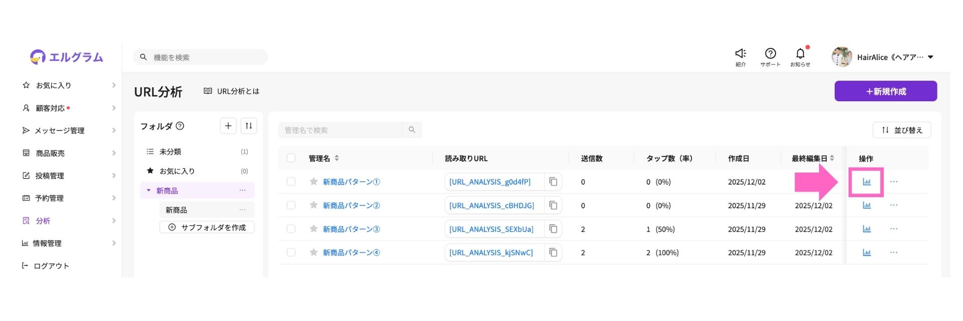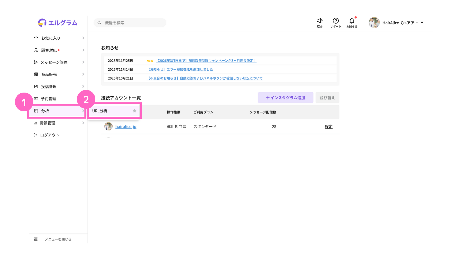URL分析とは、エルグラムから送信したURLの送信数やクリック率を測定できる機能です。