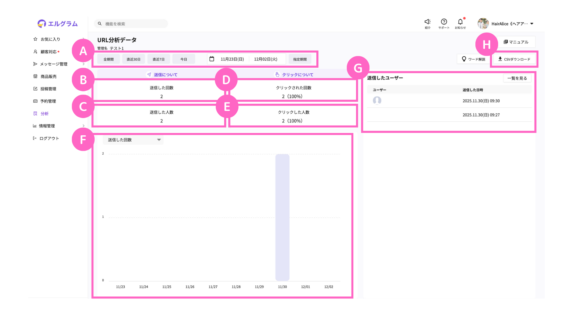 | F | データグラフ | 送信回数の推移やクリック率の推移を確認可能 |