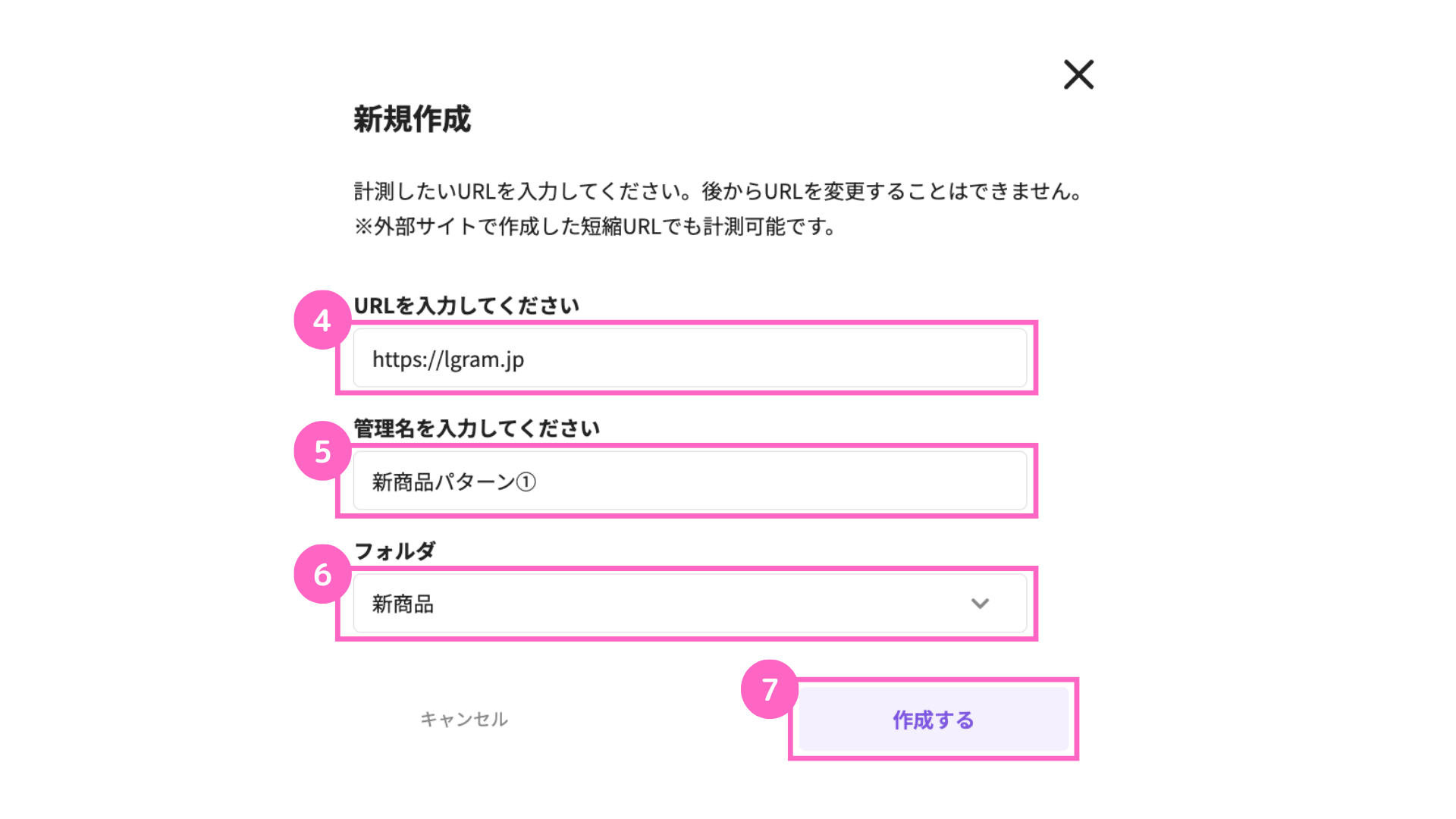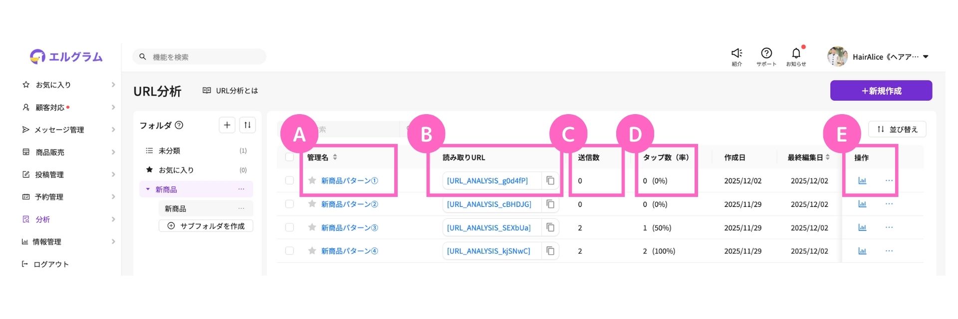 | A | 管理名 | 作成したURLの管理名が確認可能 |