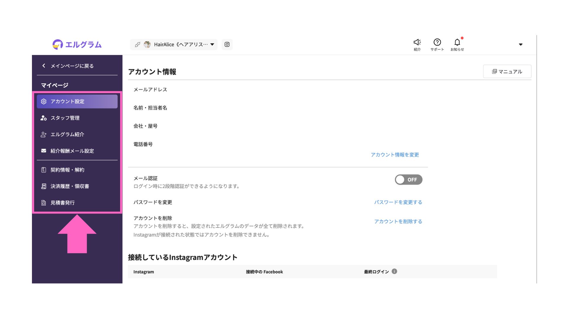 マイページには、エルグラムを円滑に運用するために必要な各種設定が集約されています。