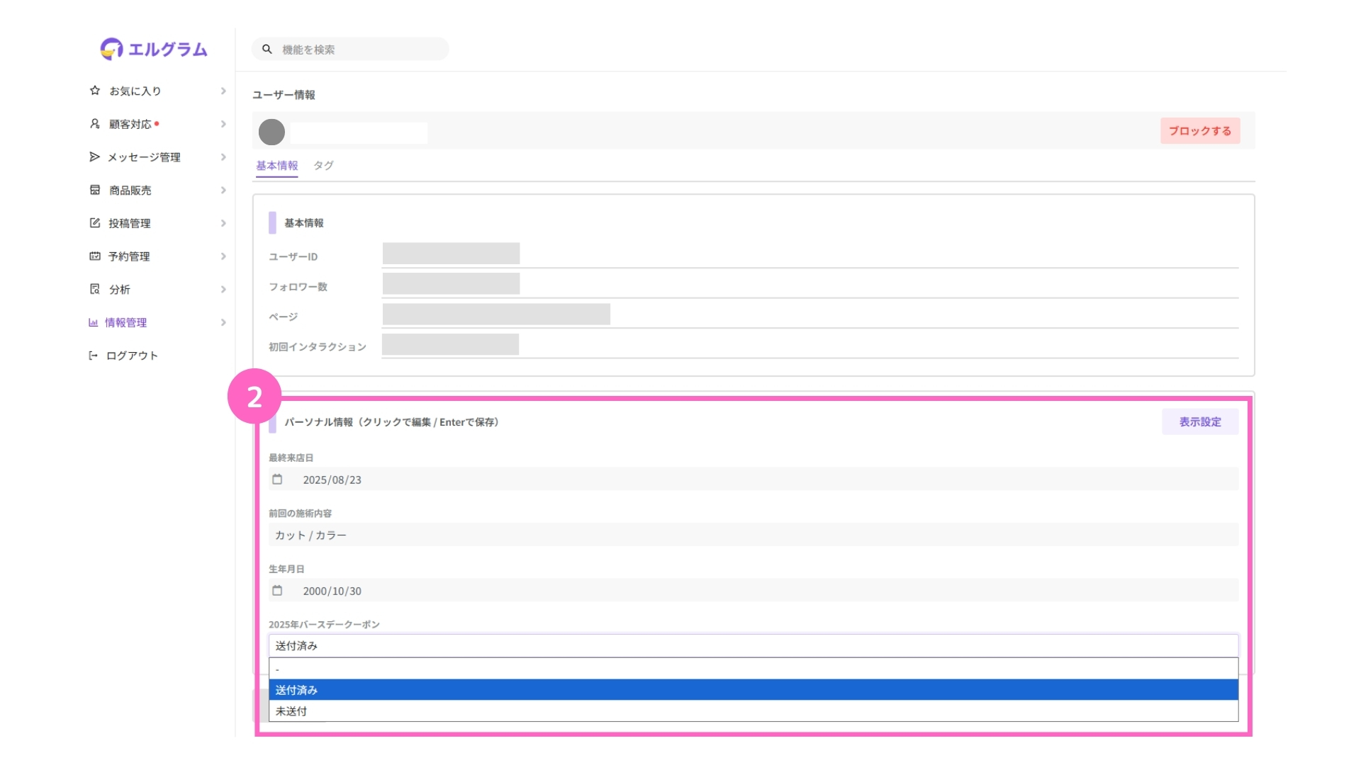 →定期来店を促し、リピート率を高められます。 - 登録された「誕生日月」の顧客を抽出し、バースデークーポンを配布