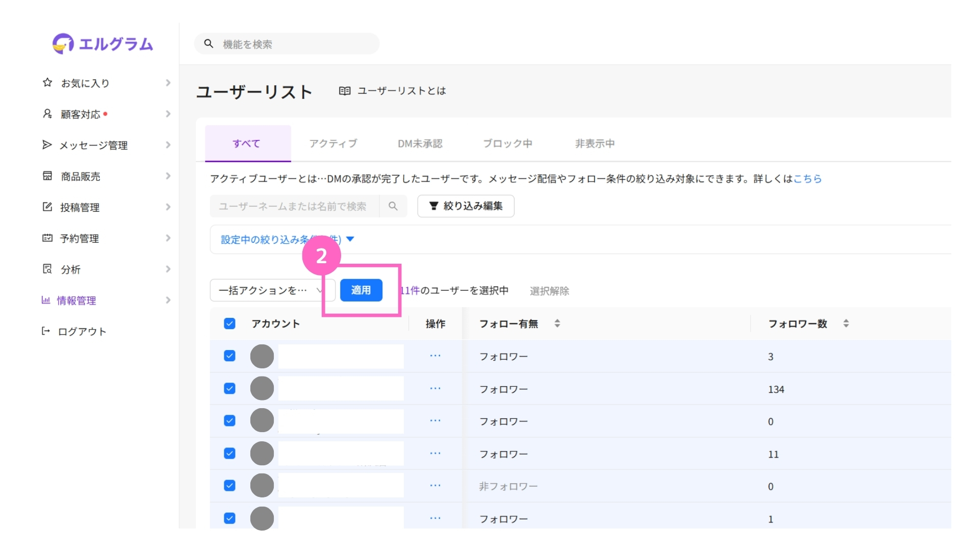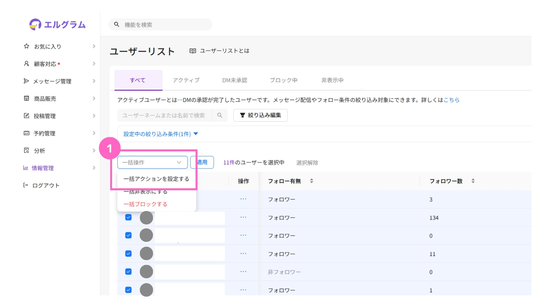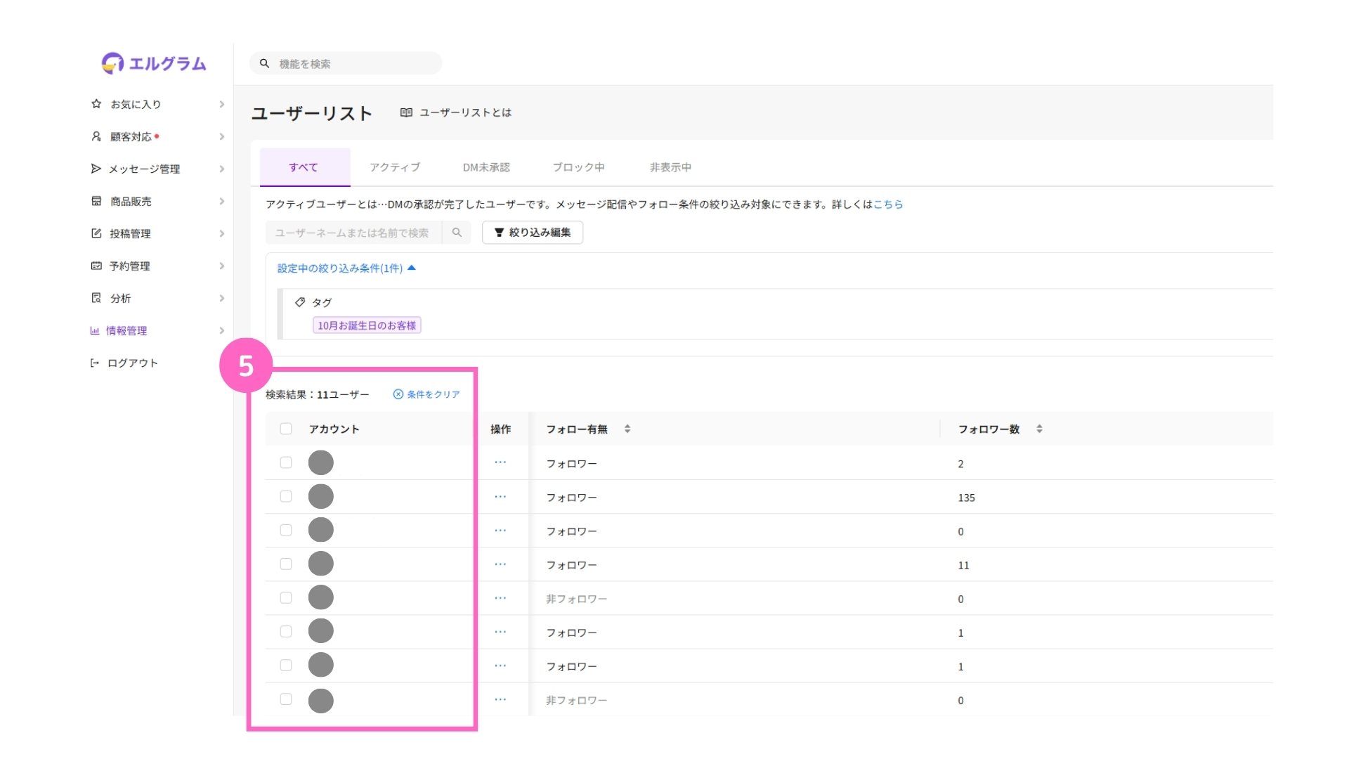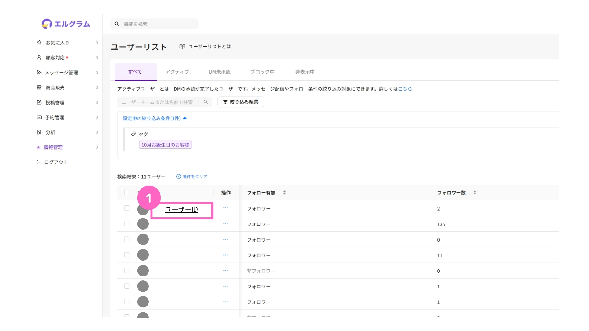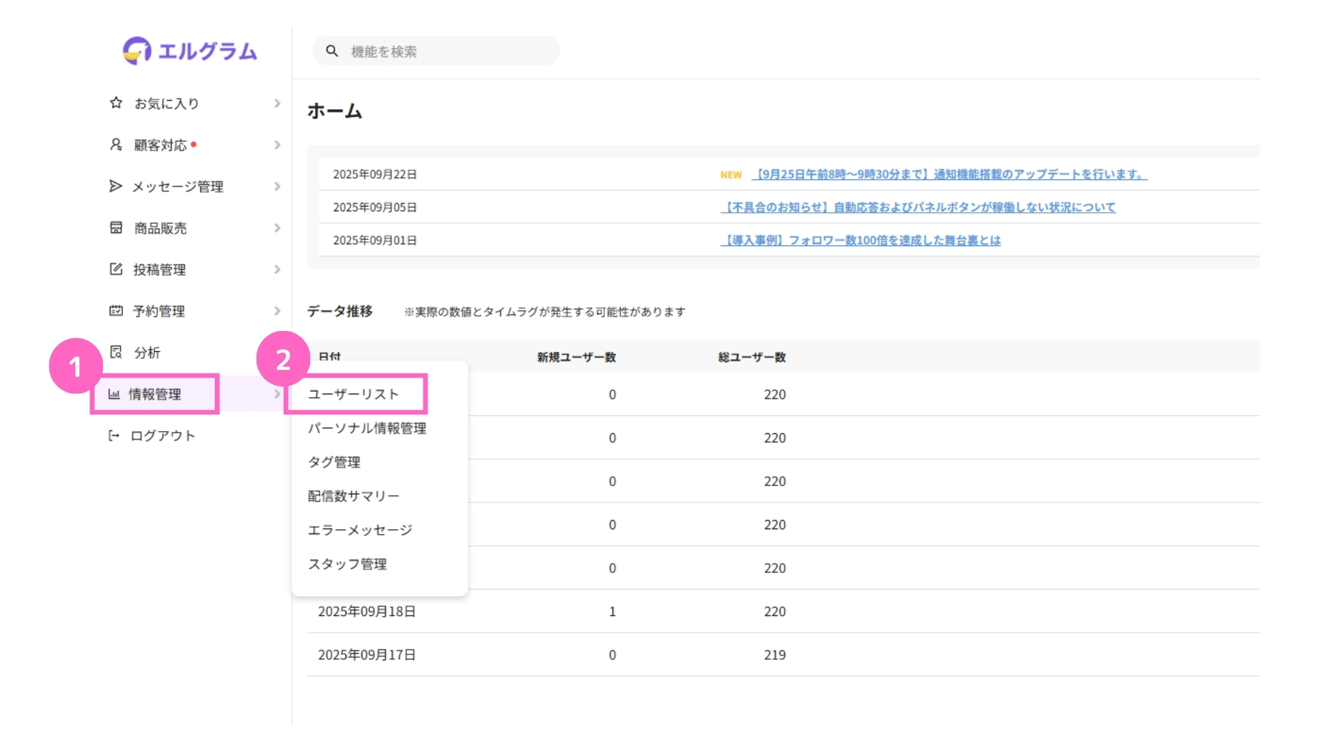 ユーザーリストは、エルグラムに登録されているユーザーを一覧で表示できる機能です。