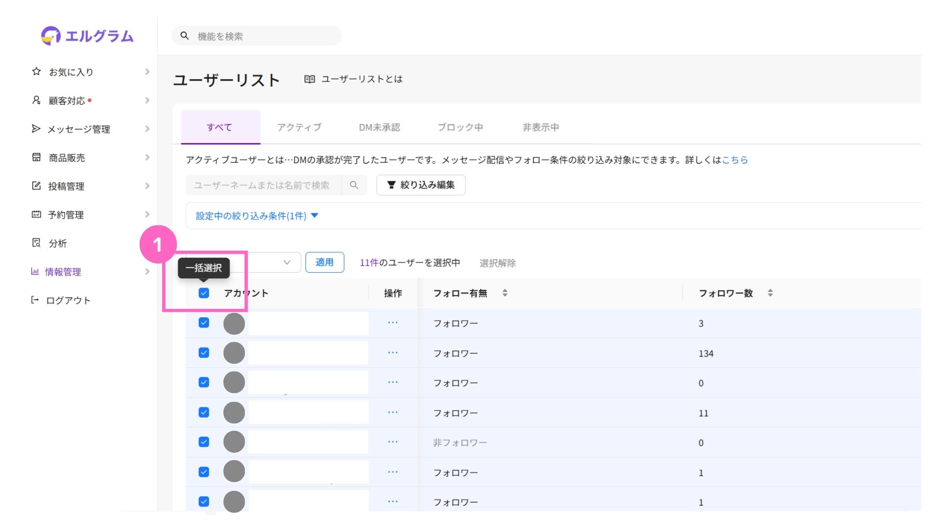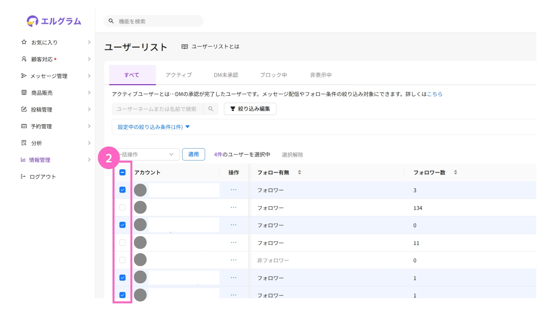 さらに「絞り込み」機能を活用することで、特定の条件を持ったユーザーだけを抽出できます。