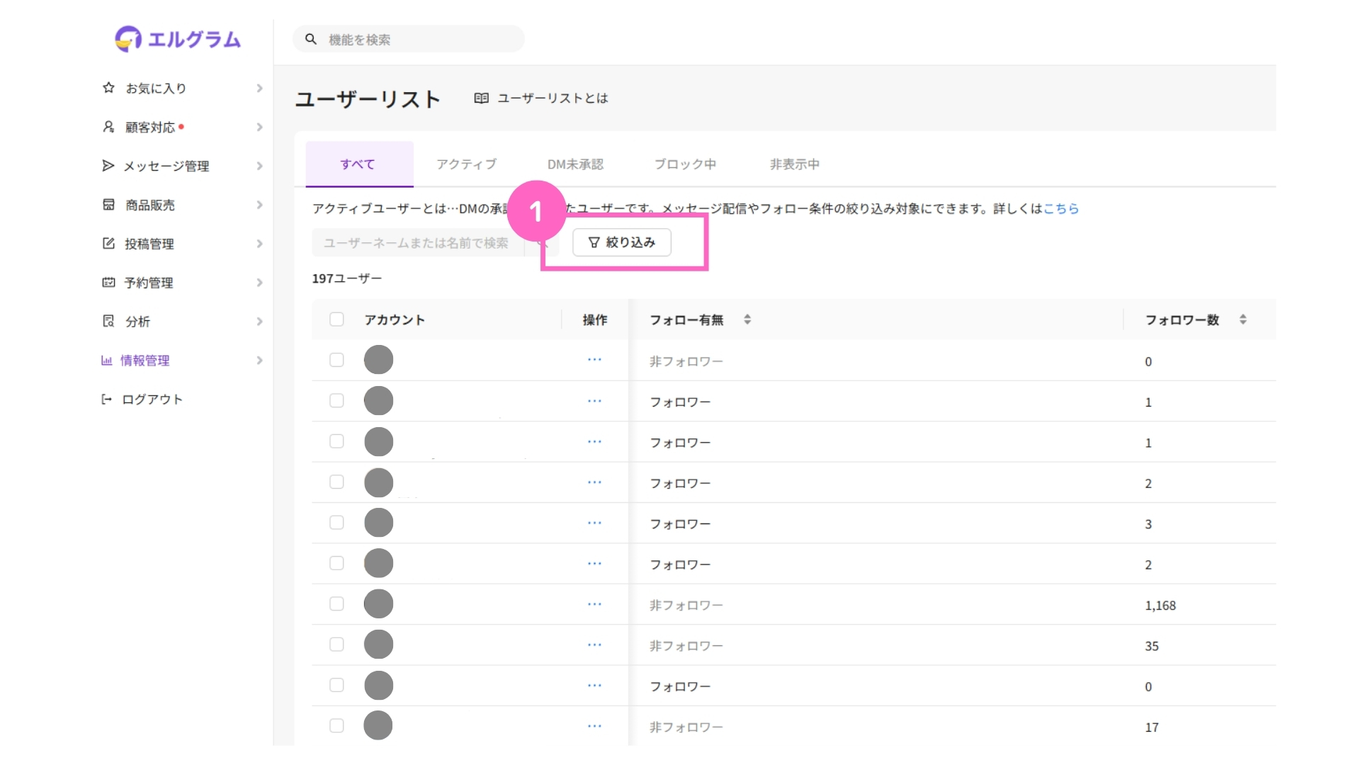 ユーザーリストは、エルグラムに登録されているユーザーを一覧で表示できる機能です。