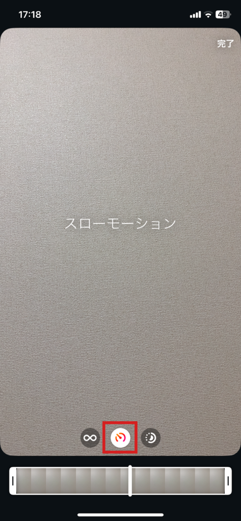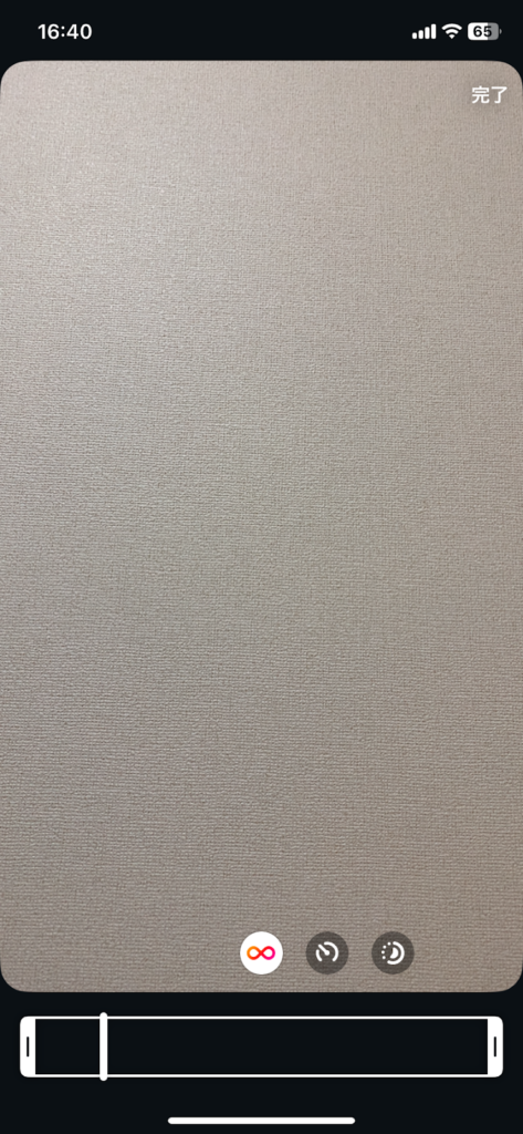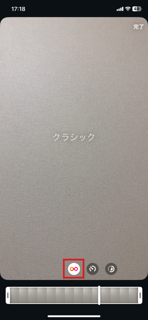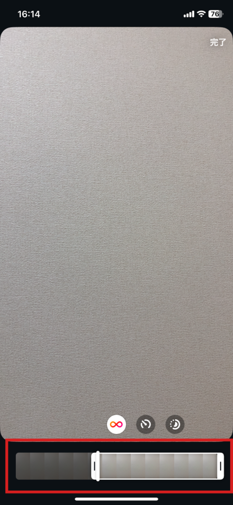 Instagramのブーメランの長さを変えたい場合、以下の画面下部のバーを移動することで長さを短くしたり、往復する位置を変えたりできます。
