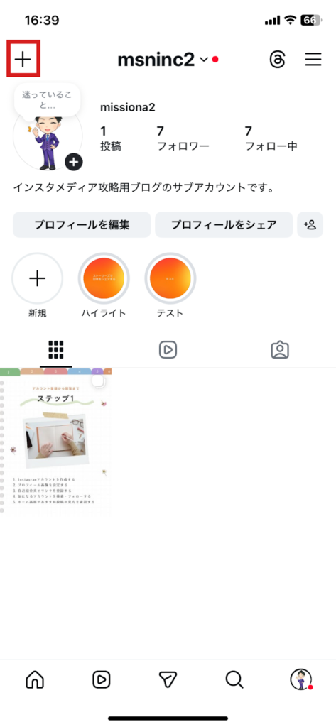 - Instagramアプリを開き、プロフィールページの左上「+」をタップ