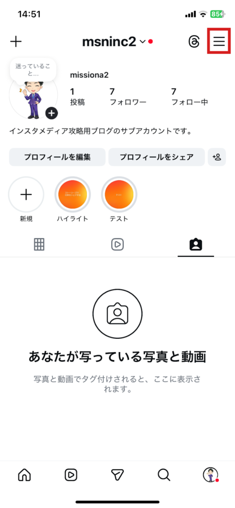 - Instagramアプリを開き、プロフィールページの右上「≡」をタップ