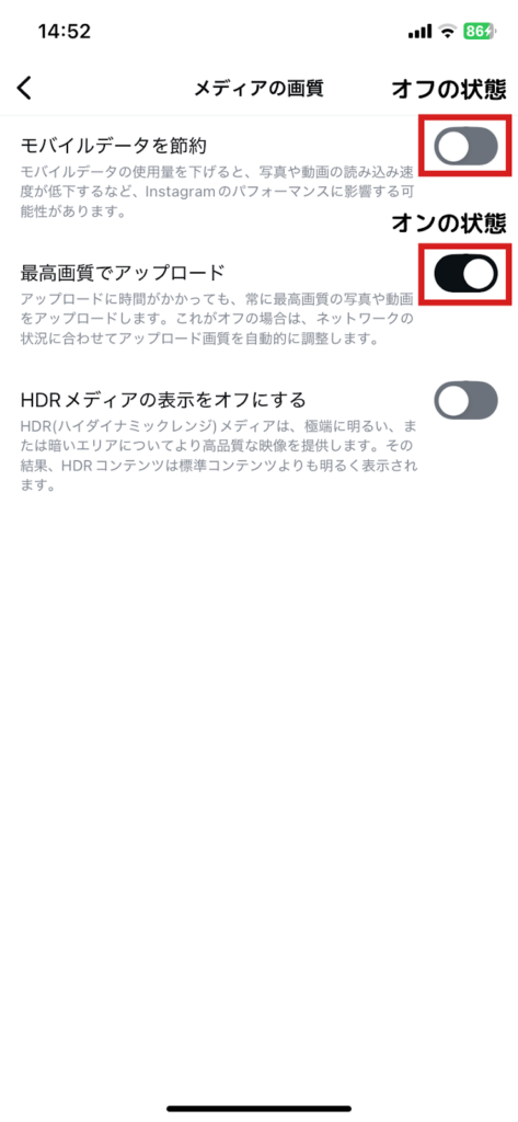- モバイルデータを節約の項目をオフ、最高画質でアップロードをオンにする