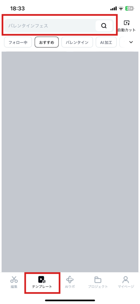 1.CapCutを開き、下部メニューの「テンプレート」をタップ