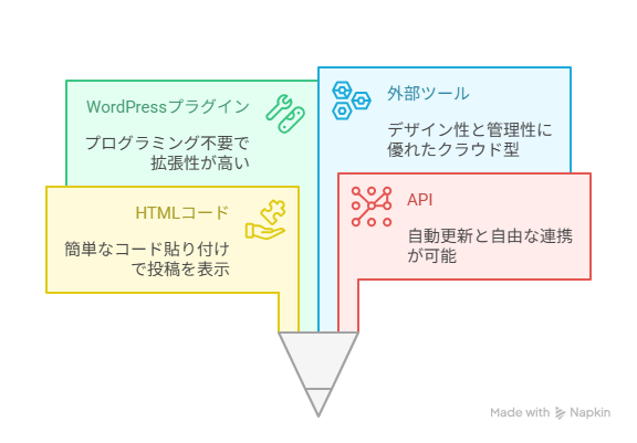 - 埋め込み方法は「コード」「API」「プラグイン」「外部ツール」の4種類がある