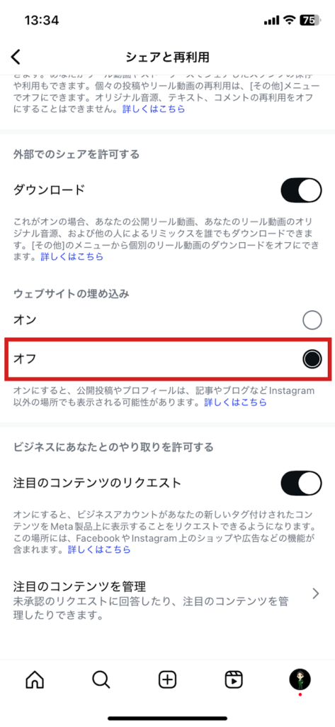 - ウェブサイトの埋め込みを「オフ」をタップ