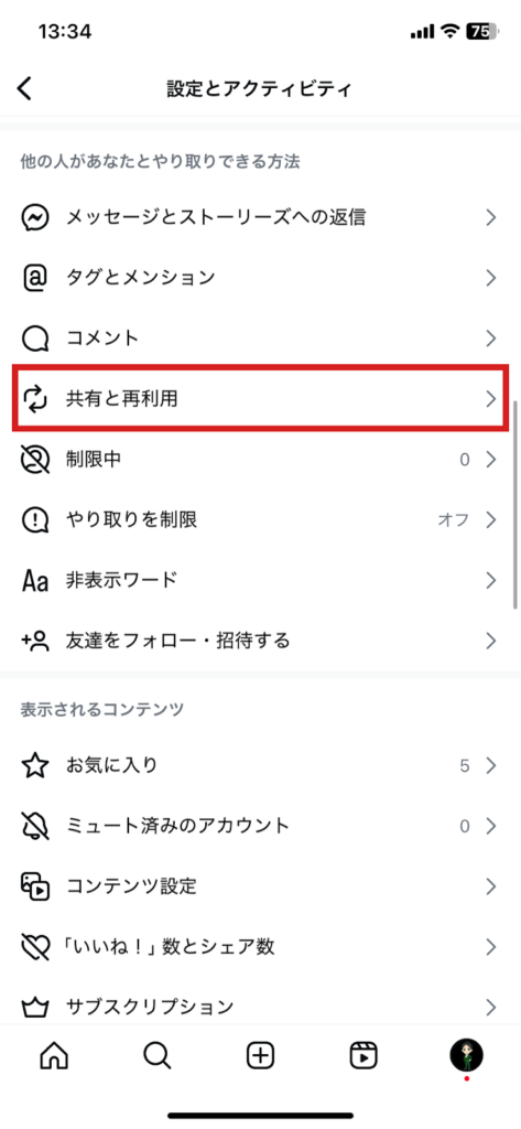 - 下にスクロールし「共有と再利用」をタップ