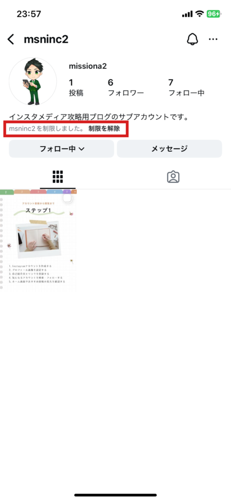 Instagramの「アカウント制限」を利用すると、制限した側では表示や通知に変化があり確認可能です。制限をかけたユーザーのプロフィールページで以下のようにされていれば、制限ができています。