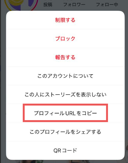このアイコンをタップし、【プロフィールURLをコピー】を選択すれば、リンクの取得が完了します。