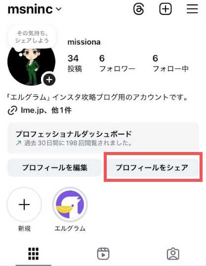 自分のアカウントのQRコードを表示したい場合は、まずホーム画面で【プロフィールをシェア】を選択してください。