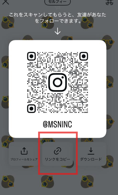 - 表示されたQRコードの下部にある【リンクをコピー】をタップ