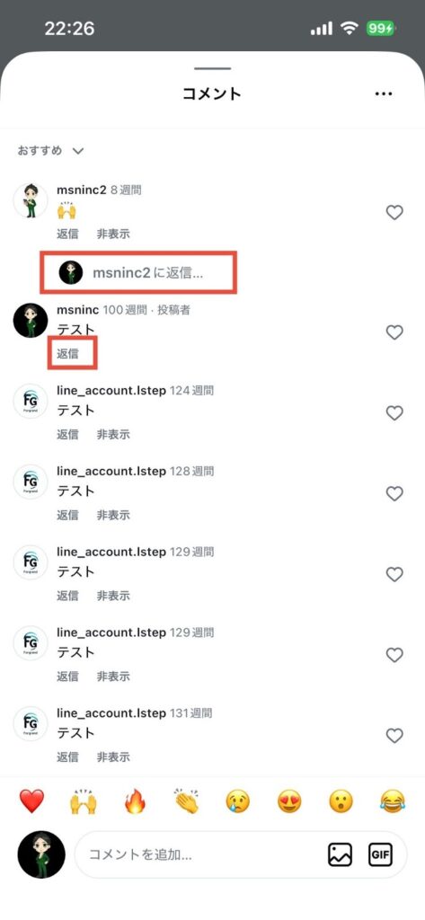 - 返信したいコメントの「(ユーザーネーム)に返信…」、または「返信」の部分をタップする