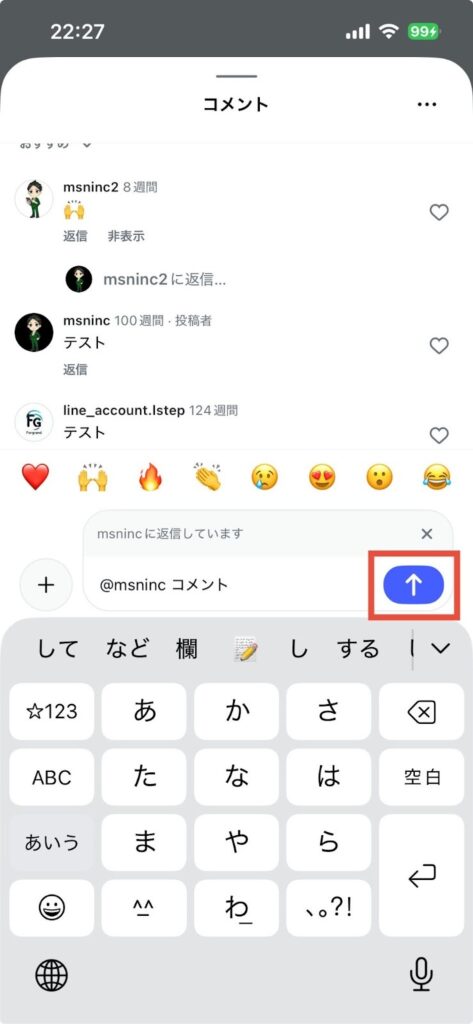 - 返信を入力して「↑」をタップし投稿する