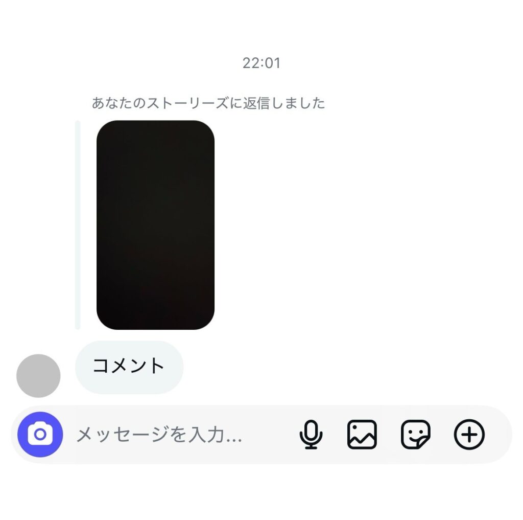 ストーリーズに送信したコメントは、投稿主とのDM画面に表示されます。