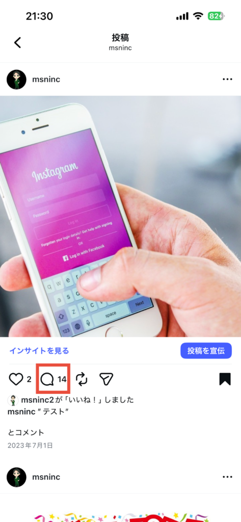 このように、フィード投稿へのコメント方法は自分の投稿でも人の投稿でも同じです。